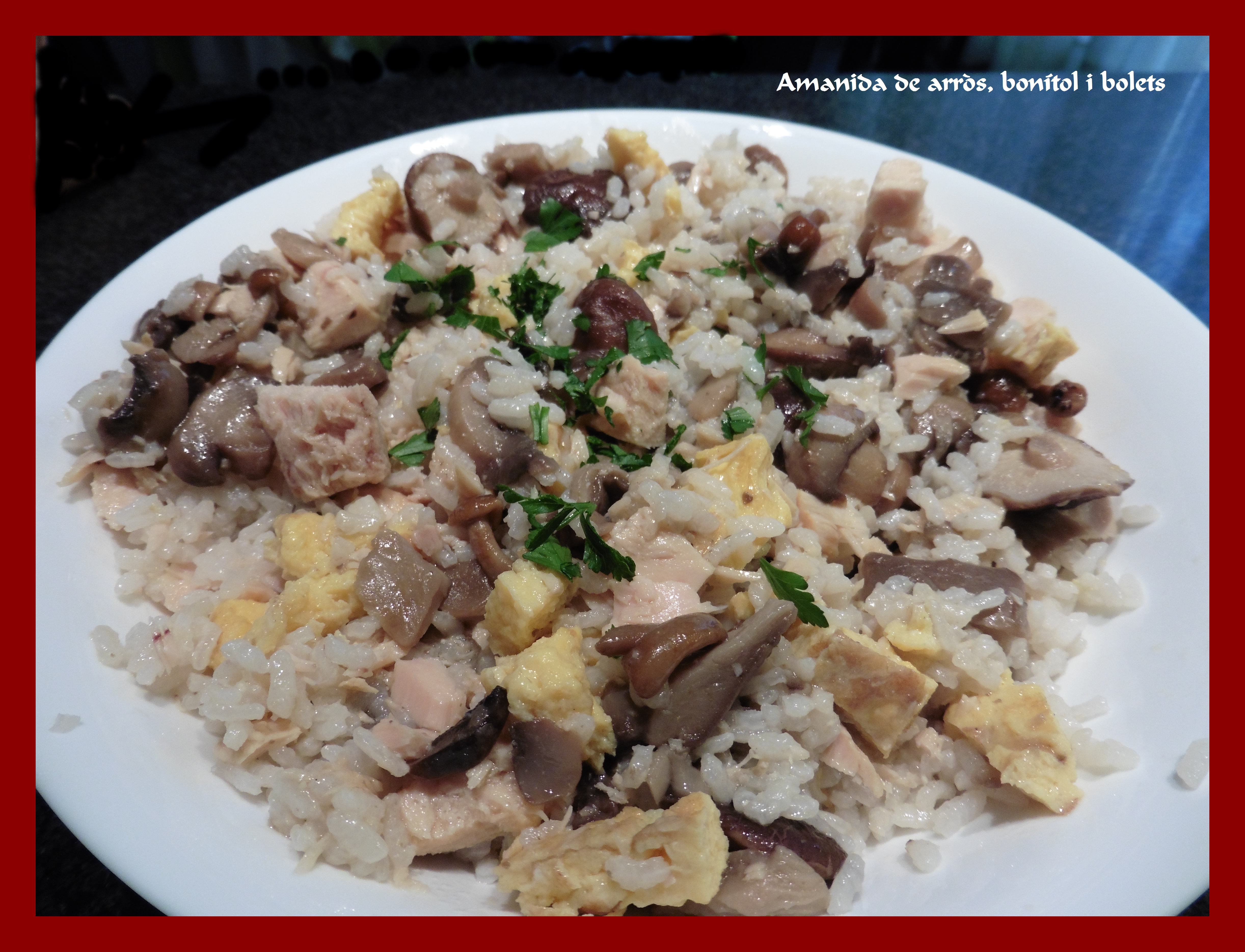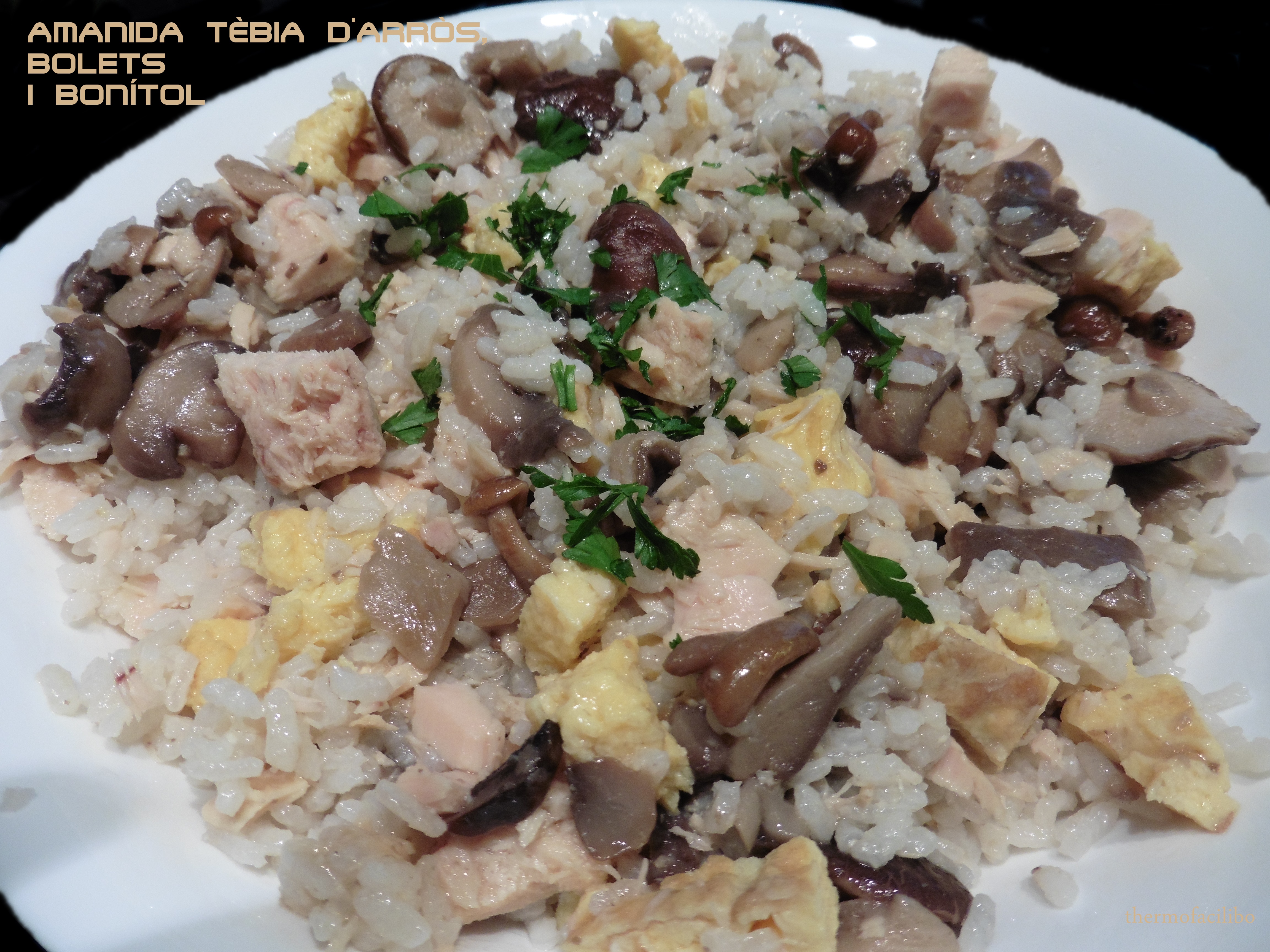 Fa dies que a la xarxa veiem paneres de bolets que fan molt i molt de goig. Ara és temporada i s’ha d’aprofitar. M’hen van regalar una panera fa uns dies i com que no vaig tenir temps de preparar-los al moment, els vaig triar, rentar i congelar fins al moment de fer-los servir. Avui els he preparat en una amanida tèbia d’arròs, que a part del sofregit de bolets i he afegit bonítol i truita tallada a trossets. És un plat que em va molt bé si l’he de deixar preparat el dia abans perque està boníssim igualment.