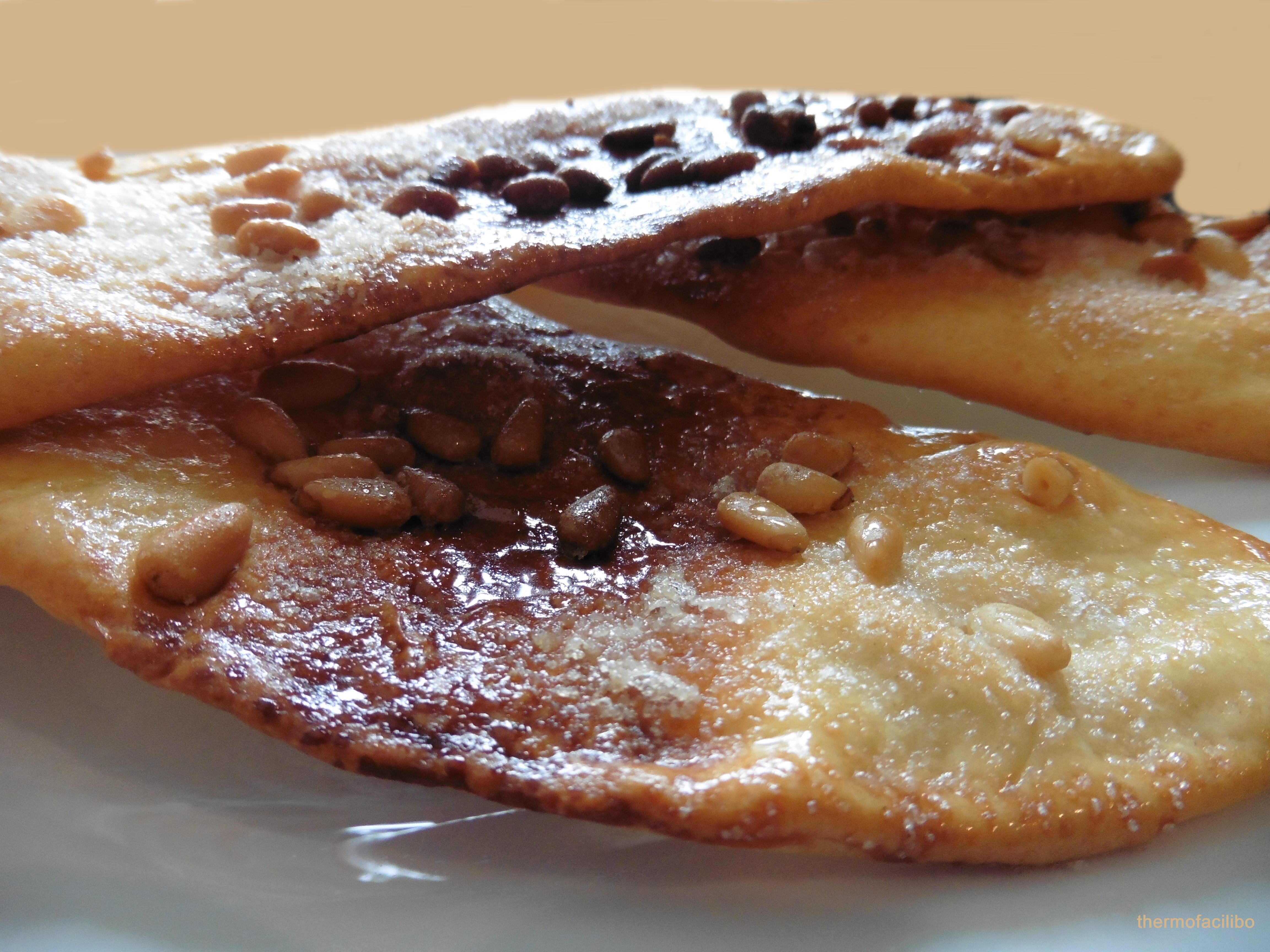 Nota: Opcionalment podem posar uns quants pinyons a sobre el sucre abans d’ enfornar. També podem congelar part de la massa. Un cop tenim les boletes fetes, les que no vulguem gastar les podem embolicar amb   film transparent i congelar, i així el dia que vulguem les descongelem unes hores abans i prosseguim amb la recepta.