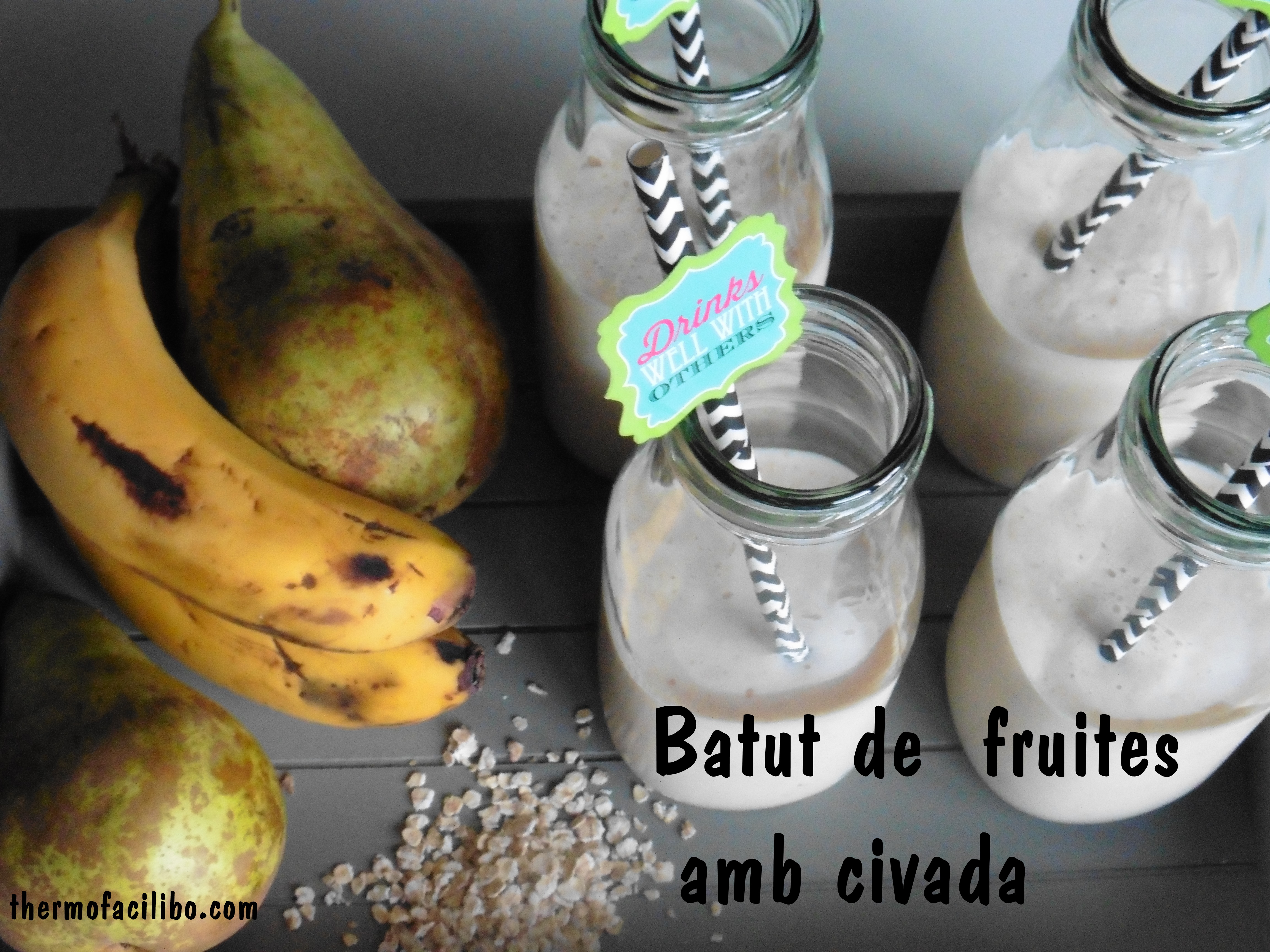 M’ agrada molt preparar sucs o batuts per esmorzars o berenars. Amb la thermomix tenim l’avantatge que es preparen en un moment i amb ingredients naturals. Els podem preparar amb tot tipus de fruites i estan boníssims. El que he fet avui és un batut a base de peres, plàtans, civada i llet. Sa, lleuger i energètic.