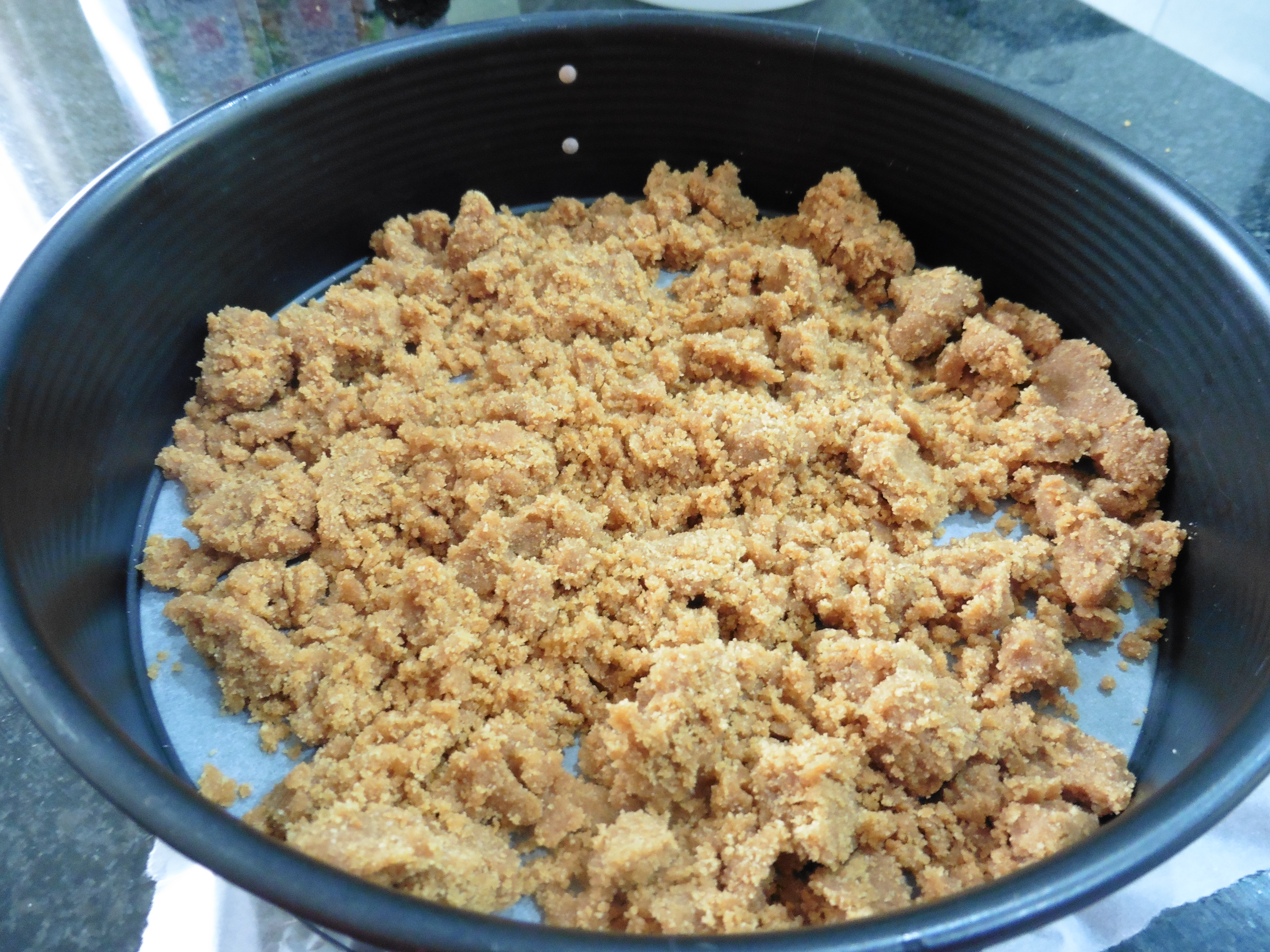 - Posem la mantega en un bol gran i la fonem al microones. Afegim les galetes triturades al bol de la mantega i remenem bé. Si queda molt sec, afegim una mica de llet.