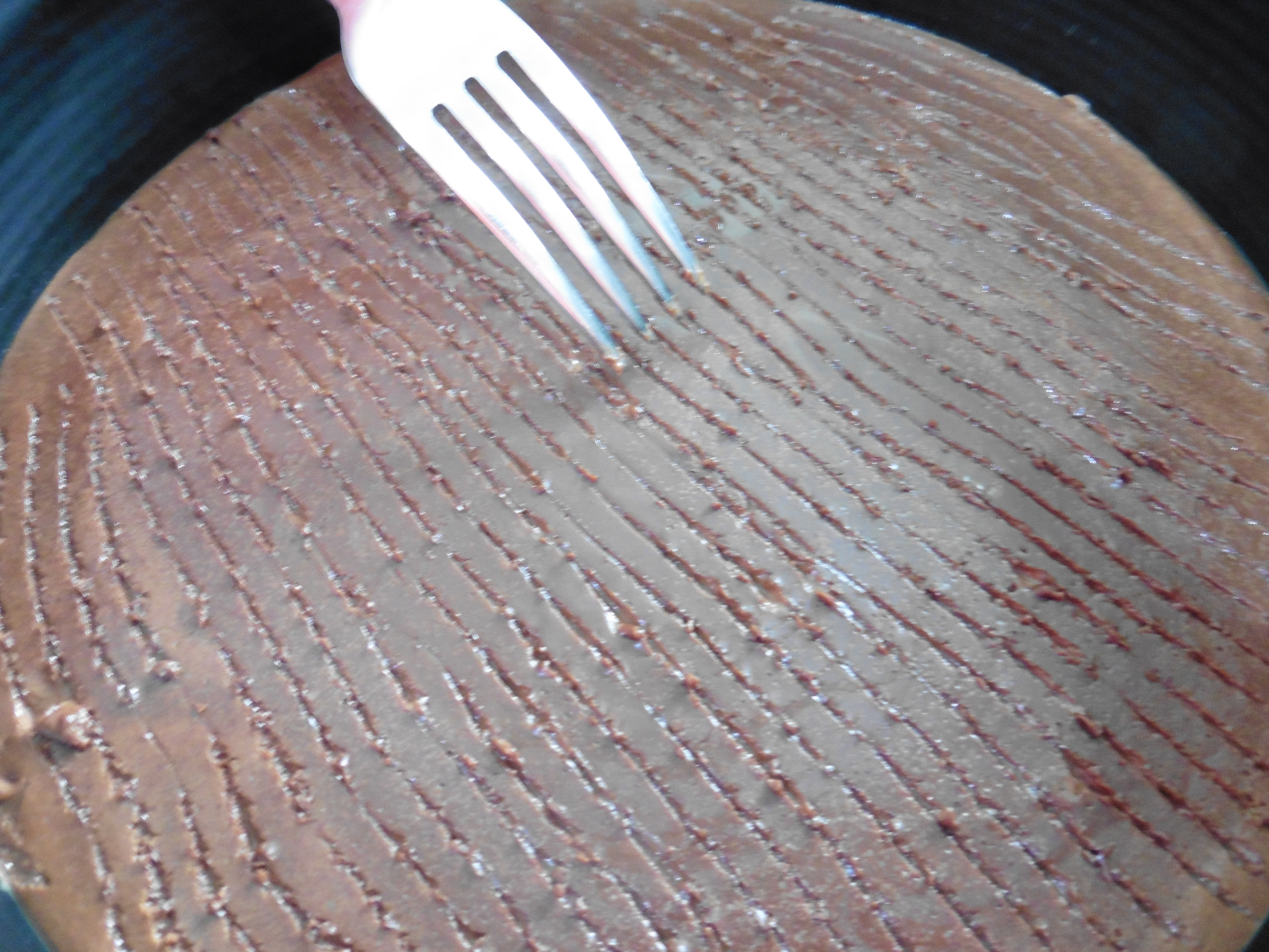 - Abans d’abocar aquesta mescla sobre la capa de xocolata negra que tenim a la nevera, amb una forquilla fem unes ratlles a aquesta capa, perquè s’uneixin les dues capes. Un cop fetes les ratlles, aboquem la mescla de xocolata amb llet, sobre la capa de xocolata negra que tenim ratllada. Amb molt de compte, tornem a agafar una cullera i primer aboquem la mescla a la cullera i que a molt poca distància caigui sobre la capa de xocolata negra. (Això o fem perquè no s’ ens desmunti la capa anterior).