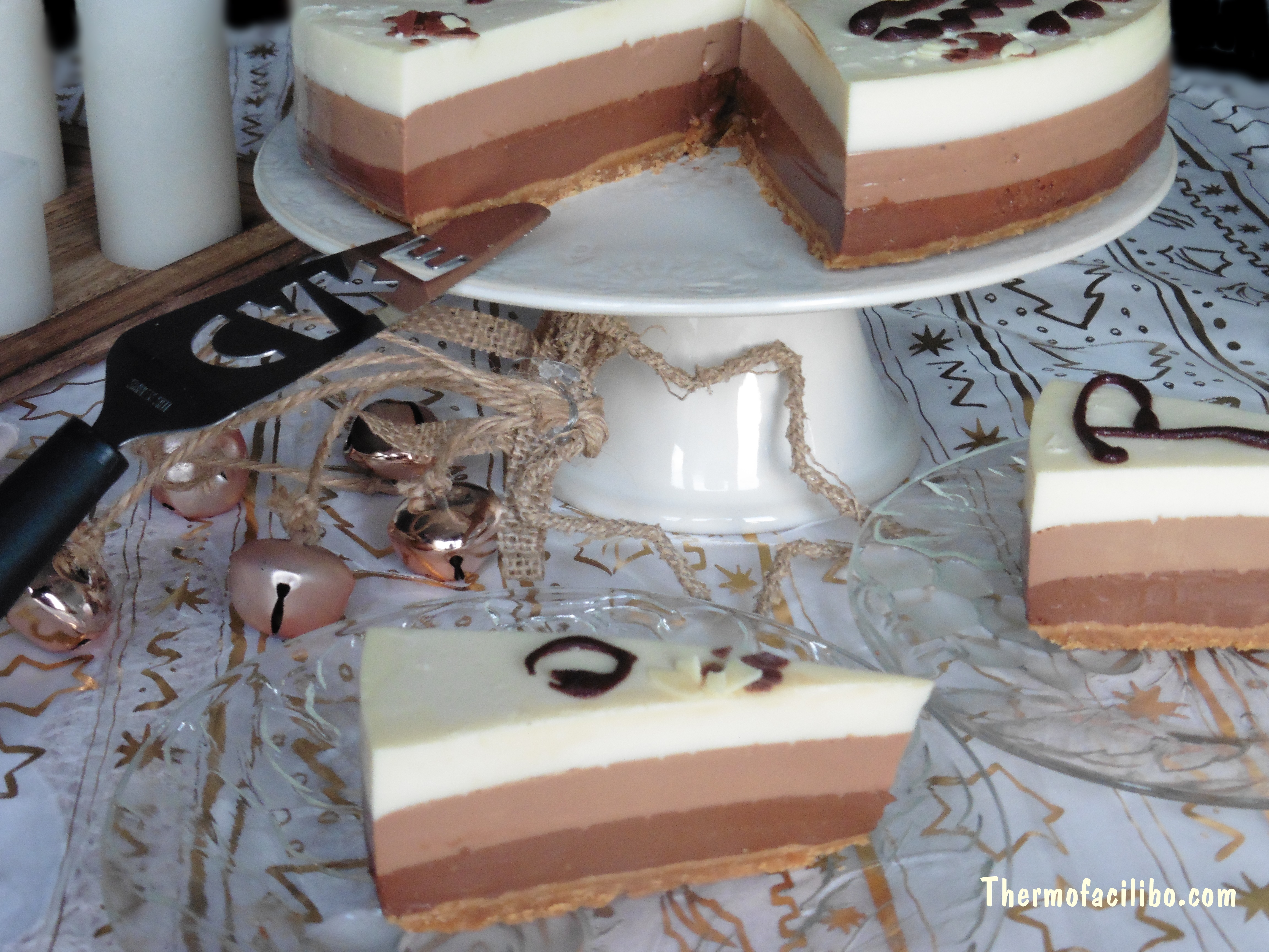 És un pastís amb una base de galetes i 3 capes de xocolata( negra, amb llet i blanca). Sempre que el preparo és un èxit. Fins i tot els que no som gaire de xocolata, com jo, ens agrada.