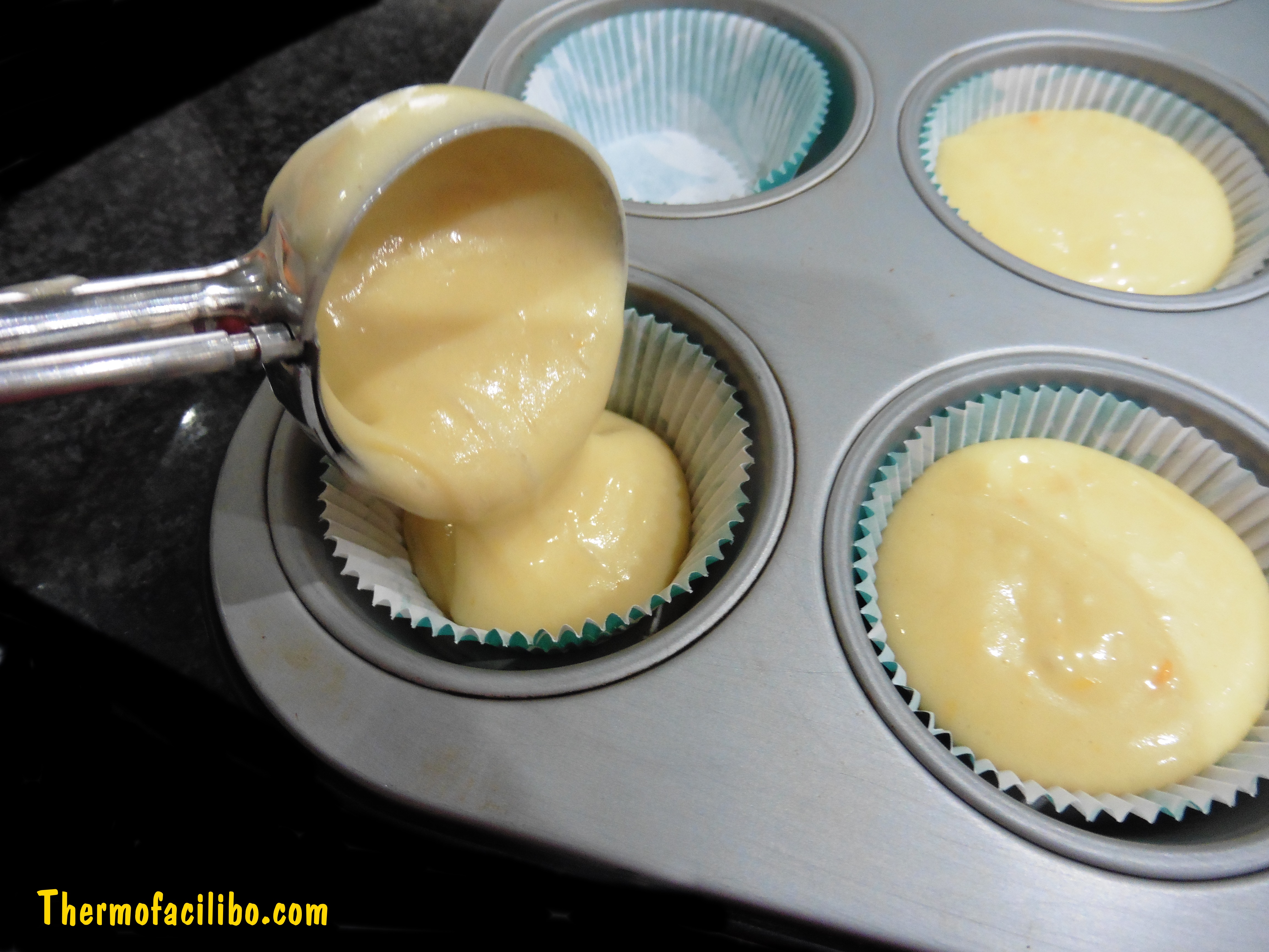 4. Mentrestant preescalfem el forn a 200°. Posem les càpsules de paper dins un motlle per magdalenes o flameres i omplim fins a 3/4 parts de les càpsules de paper. (jo m’ ajudo de l’aparell de fer les boles de gelat per omplir les càpsules) magdalenes de mandarina