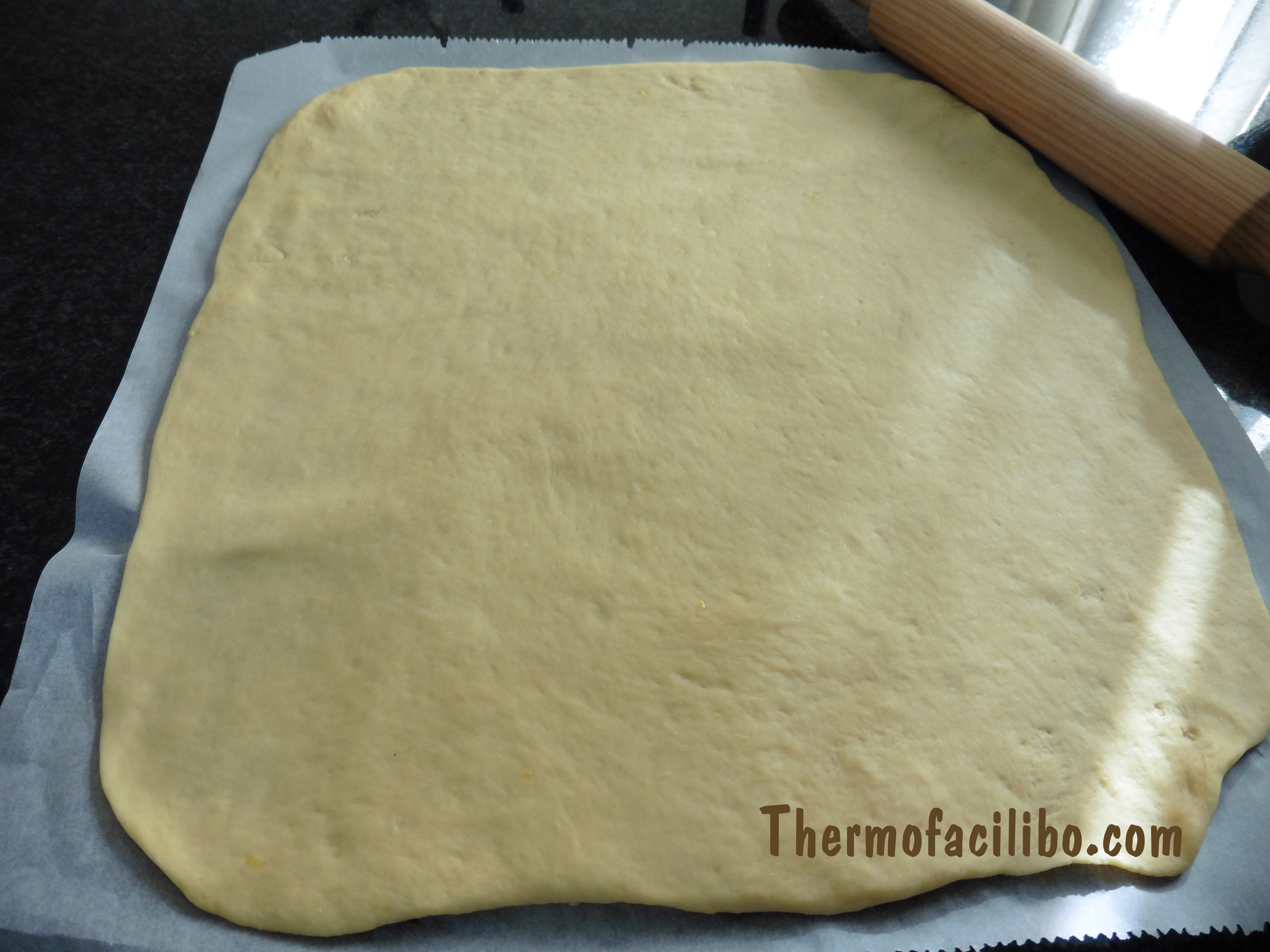 - Amb l’ajut d’un corró de cuina, hem d’estirar la massa i donar-li forma de rectangle de 40x50cm. aprox.