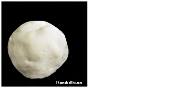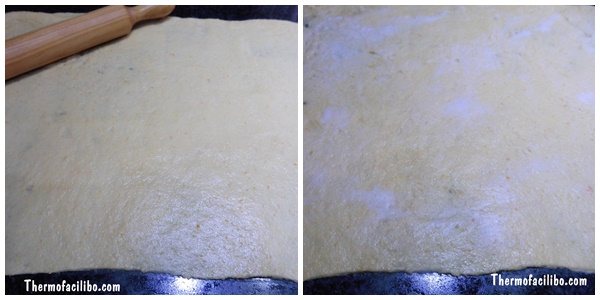 8.Arribats en aquest punt, podem retirar-la en un bol i posar-la a la nevera tapada amb film transparent. Al dia següent amassar-la una mica per desgasificar-la, deixar-la reposar uns 15 minuts, farcir-la, donar-li forma i esperar que llevi unes 2 hores. Després fornejar. Per tant, podem decidir si acabar la recepta o deixar-la per acabar l’ endemà. Si volem continuar la recepta, deixem llevar durant un parell d’hores dins el got de la thermomix ( tapat amb un drap de cuina).