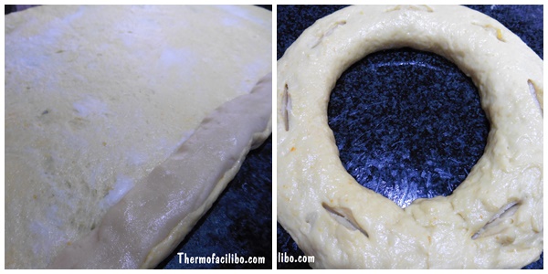 10.Per fer-ho, amb un corró de cuina formarem un rectangle amb la massa, escamparem una mica de llard per sobre i posarem el massapà amb forma de rotllo en un lateral i anirem enrotllant la massa amb el massapà dins. Un cop fet el rul·lo ajuntarem, per fer una rotllana. Ara és el moment d’ amagar la fava i la figureta dins la massa del tortell (les amagarem per la part de sota, perquè així no deixarem la marca visible). Fems uns talls per la part de sobre del tortell.