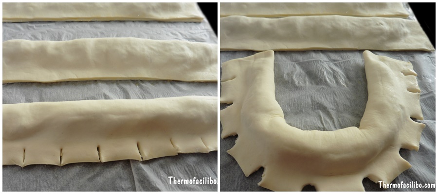 6- Fem talls de 2 o 3 cm.,li donem la forma de ferradura i les posem a la safata que teníem reservada.