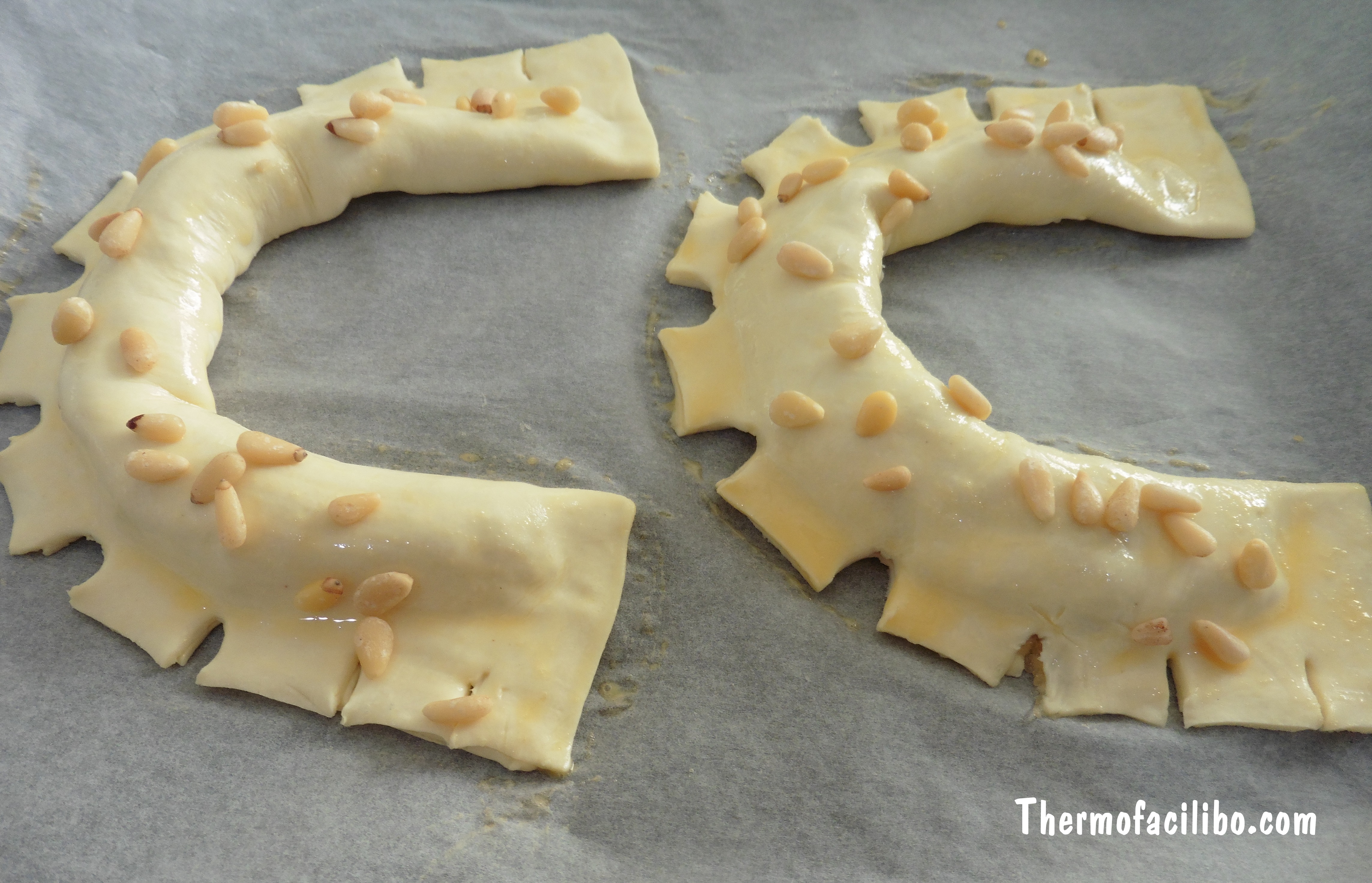 7-Pinzellem la superfície amb ou batut, repartim els pinyons i fornegem a 200° amb ventilador, durant 15 minuts aprox. o fins que estiguin dorades.