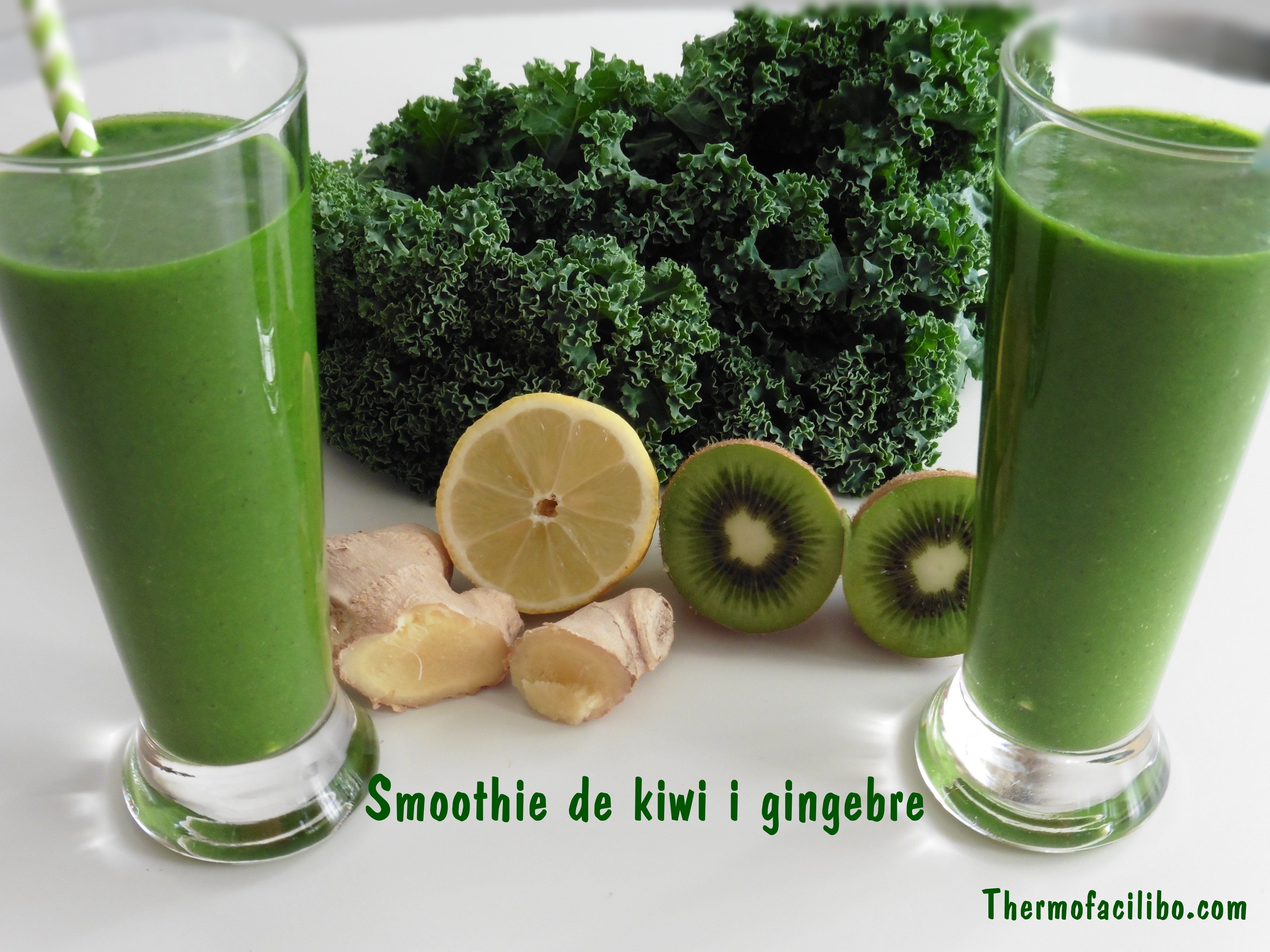 smoothie de kiwi i gingebre.Comencem la setmana amb un smoothie d’un color verd intens. Potser algú pot arrufar el nas en veure els ingredients; col arrissada (Kale), gingebre, kiwis.. S’ha de probar. Però jo personalment el trobo boníssim i a casa meva els agrada a tots.