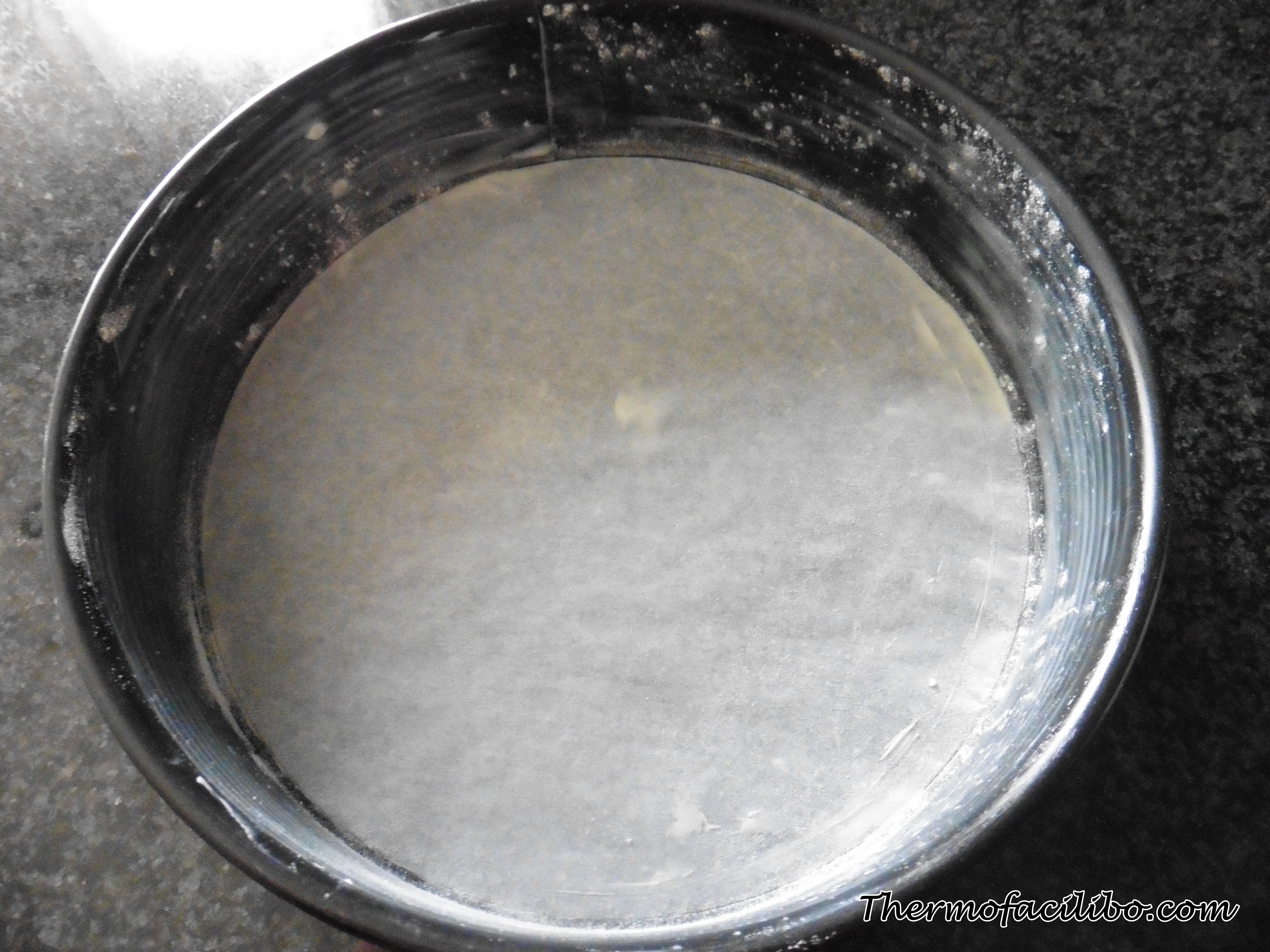 - Folrem la base d’un motlle de 24 cm de diàmetre amb paper de fornejar. Untem les parets del motlle amb mantega i repartim una mica de farina per sobre. Reservem.