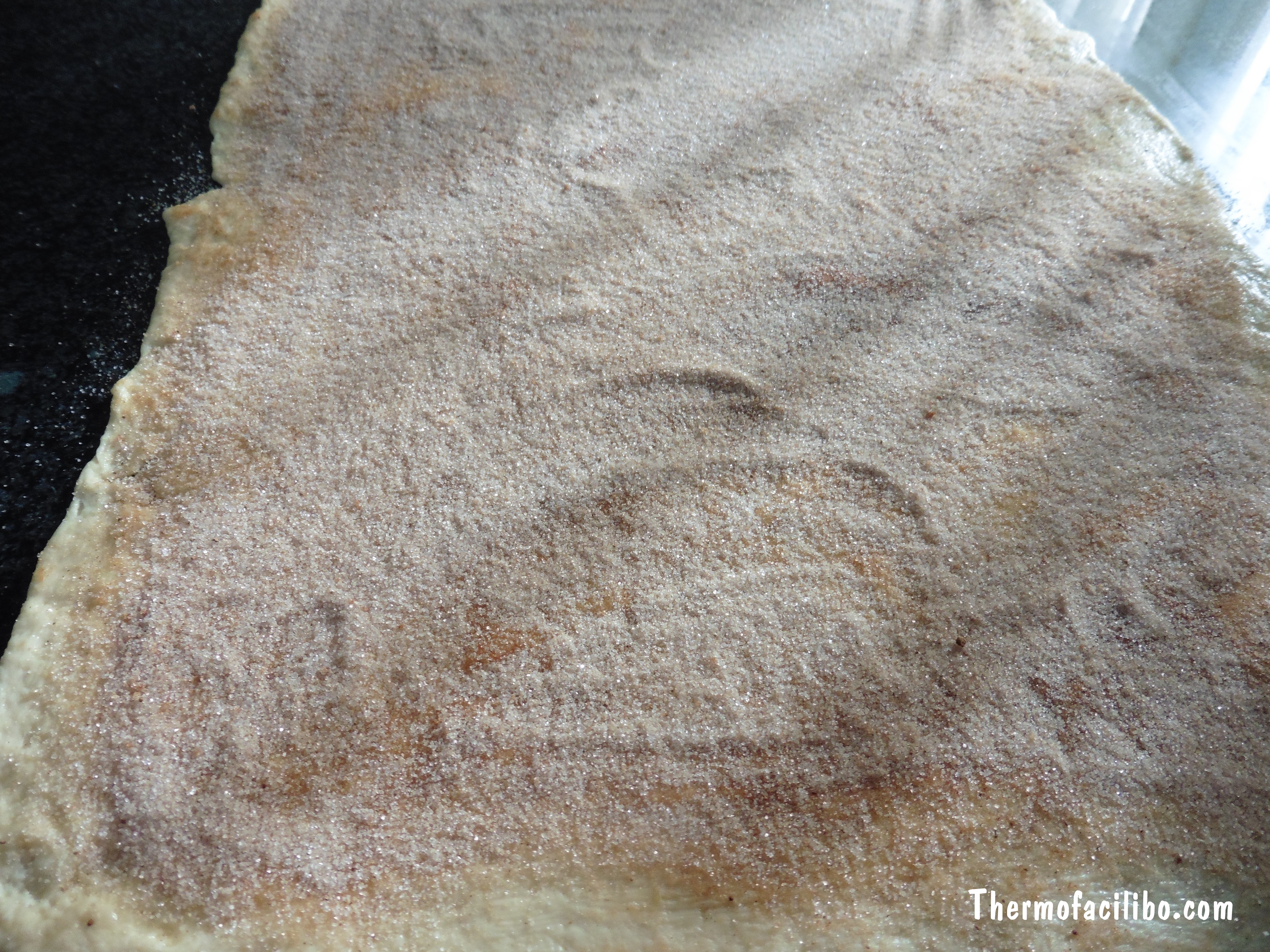 2.- Pinzellem tota la superfície de la massa amb la mantega fosa (hem de posar tota la mantega) A continuació per sobre escampem la barreja de sucre, canyella i nou moscada.