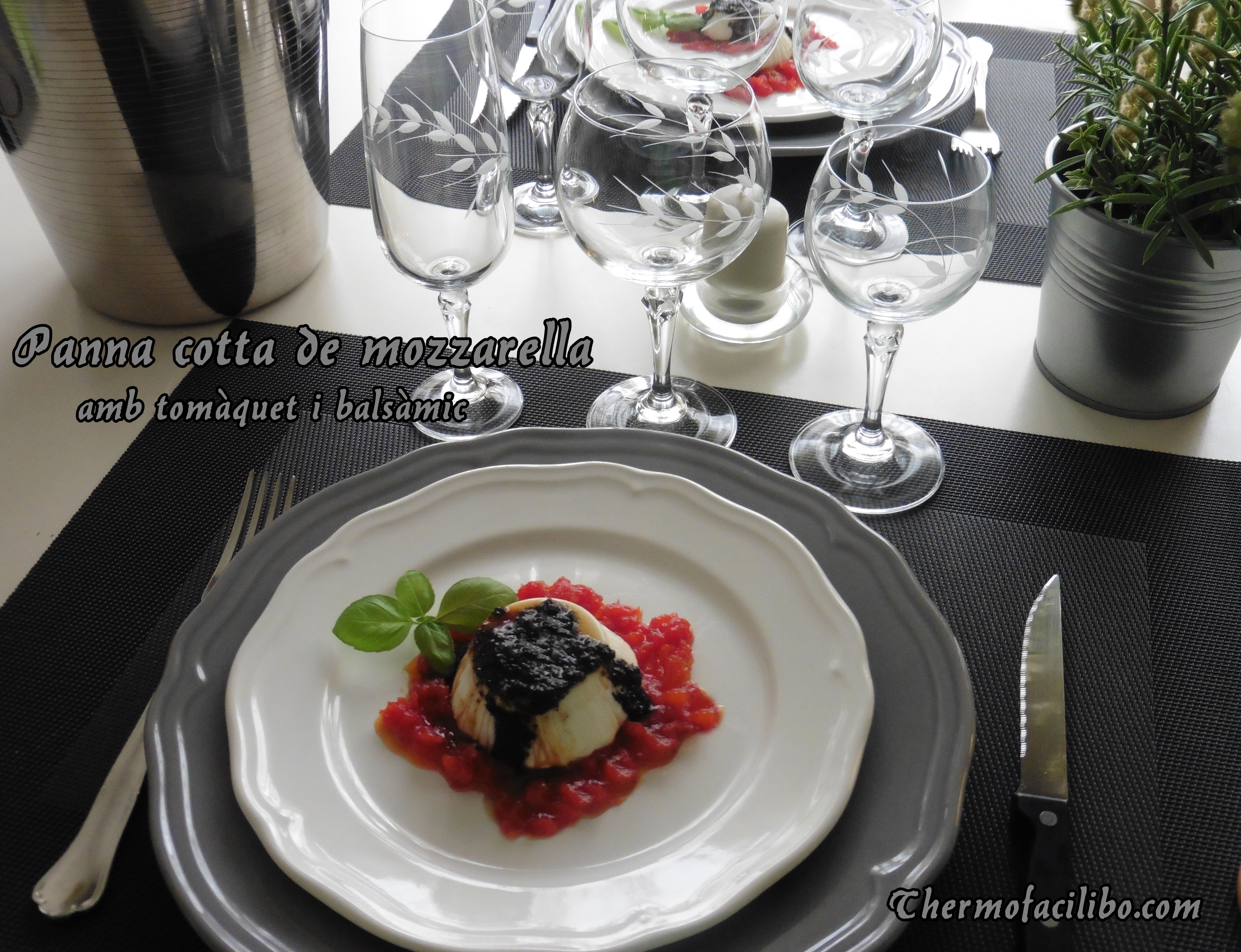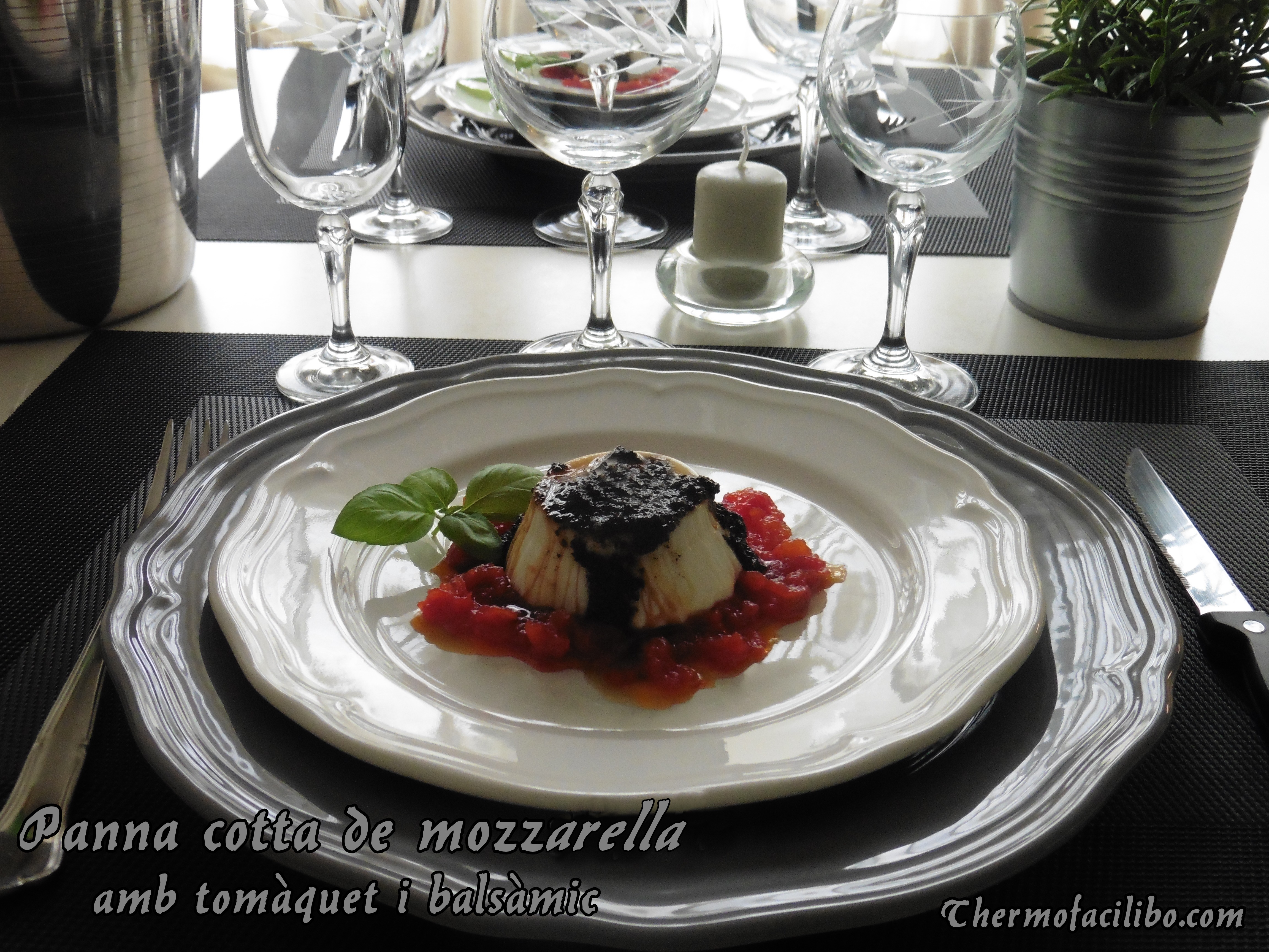 - En un plat, col·loquem un parell de cullerades de tomàquet confitat, desemmotllem la panna cotta a sobre, afegim un rajolí de reducció de balsàmic i una culleradeta d’oli d’olives negres. Decorem amb unes fulles d’alfàbrega i un polsim de sal en escames.