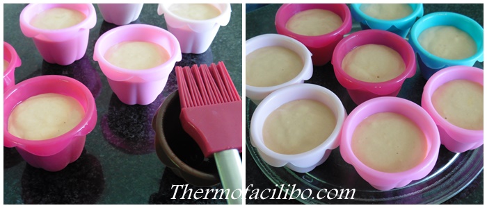 - Aboquem la mescla dins els motlles reservats i col·loquem al microones. Programem 6 minuts a 800 w. Acabat el temps, els deixem 5 minuts més dins el microones apagat i amb la porta tancada (així s’acabaran de fer). Abans de retirar-los fem la prova de l’escuradents, per comprovar que estan ben cuits.