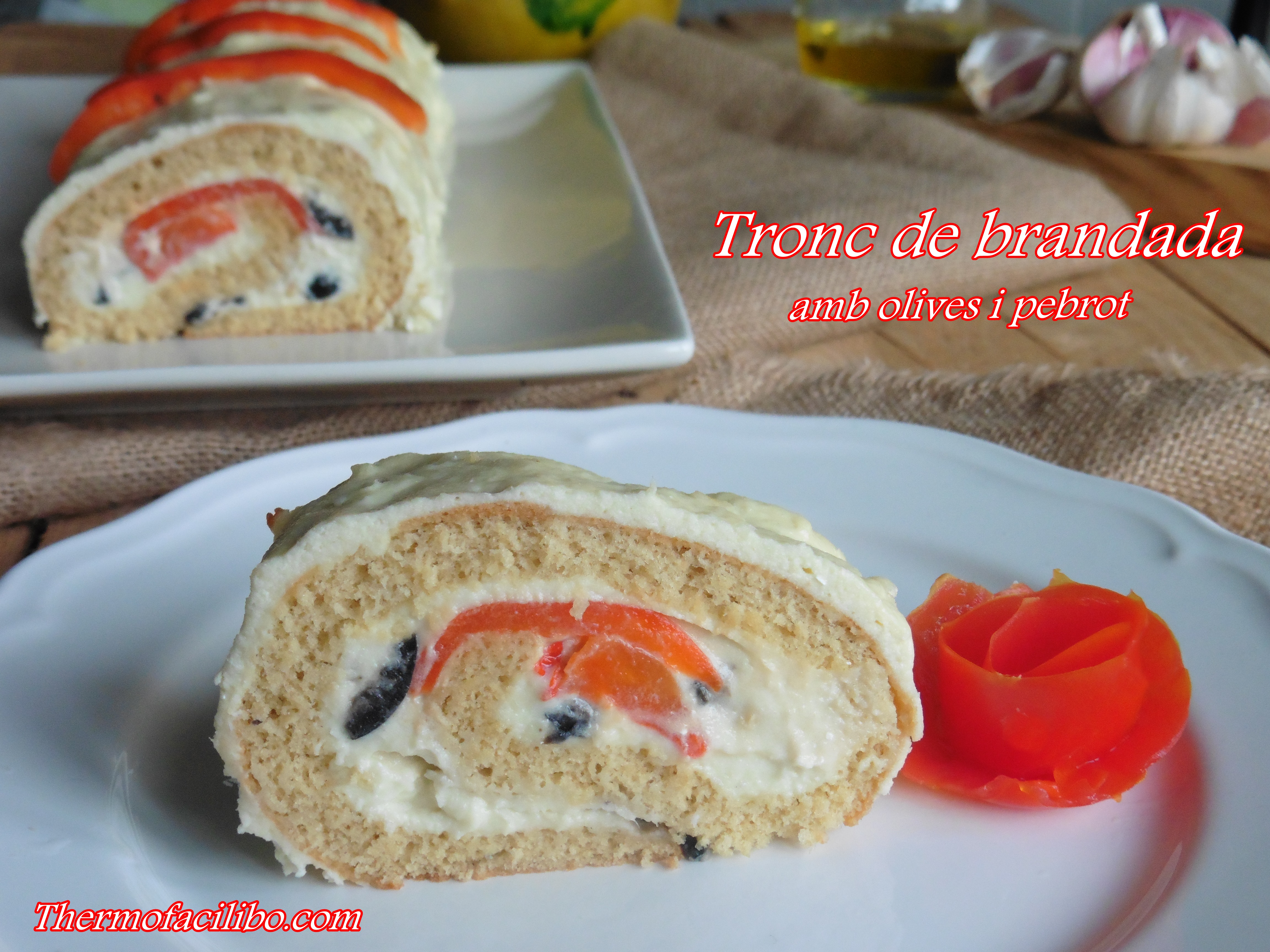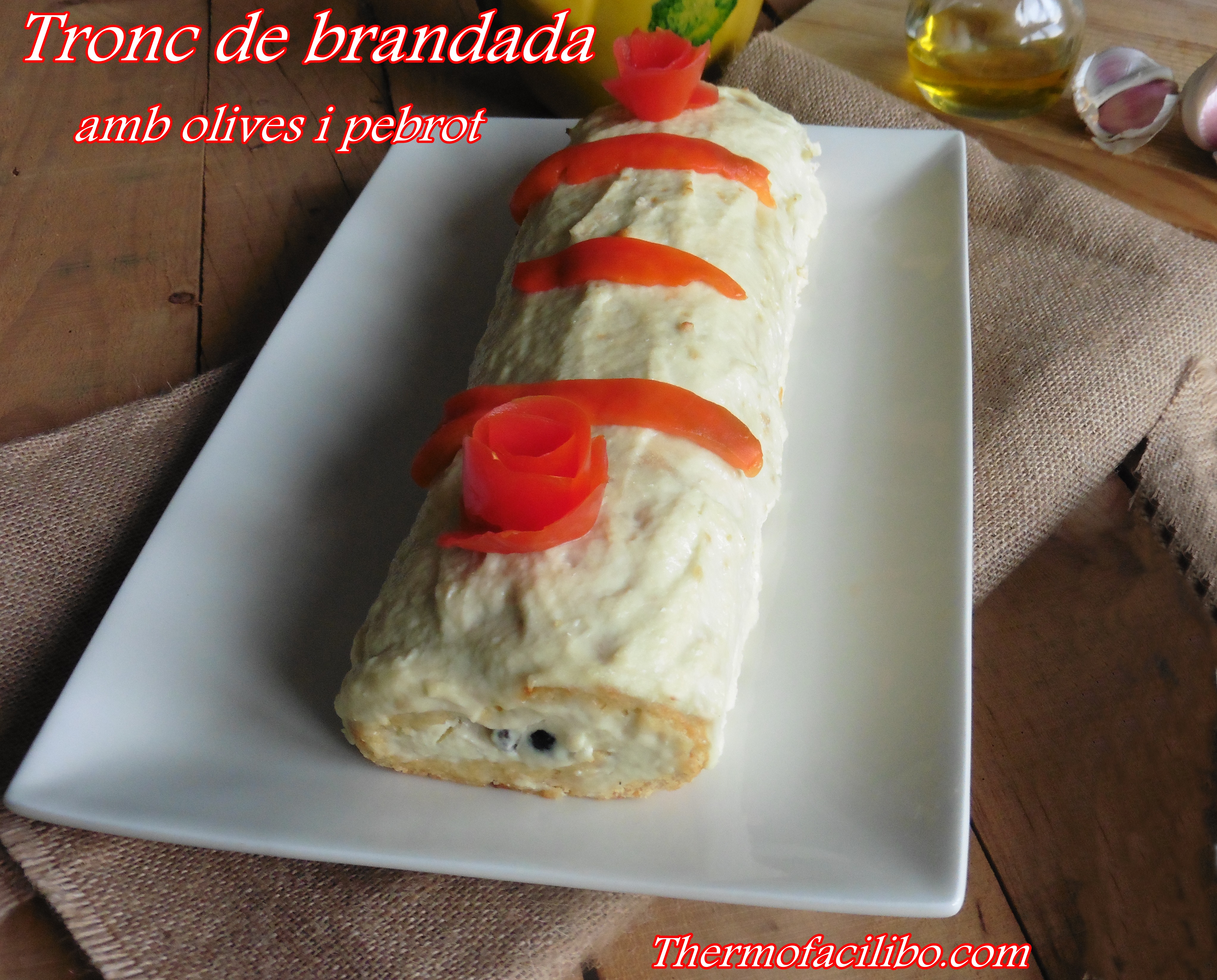 La recepta d’avui és un tronc o braç de gitano recobert amb brandada de bacallà i farcit també de brandada, pebrots del «piquillo» i olives negres. Jo l’acostumo a preparar al vespre per menjar-lo l’endemà al migdia, perquè tot i que es pot menjar tebi a nosaltres com més ens agrada és fred. Són tan còmodes les receptes que es poden deixar preparades amb antelació!