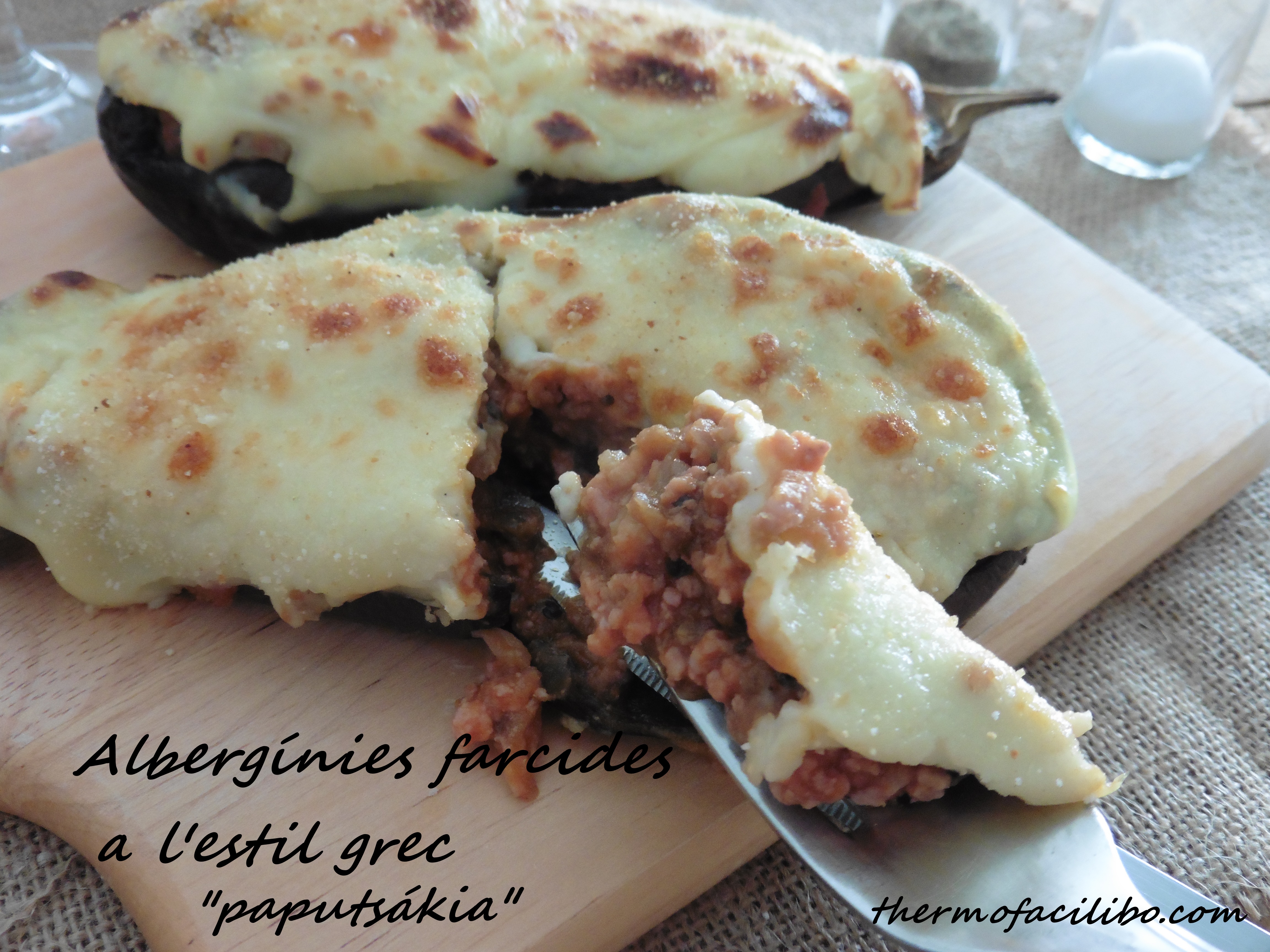 Sovint m’agrada provar receptes noves, i avui no a set una excepció. Tenia pensat preparar unes albergínies farcides, amb carn picada o tonyina (que ens agraden molt), però fa uns dies fullejant el magazín de thermomix vaig veure aquesta recepta i tot i que hi he fet canvis al meu gust, com ara coure les albergínies al microones (per guanyar temps), sí que he conservat l’essència grega de la recepta, preparant el farcit amb una branca de canyella i fent la beixamel amb ou.