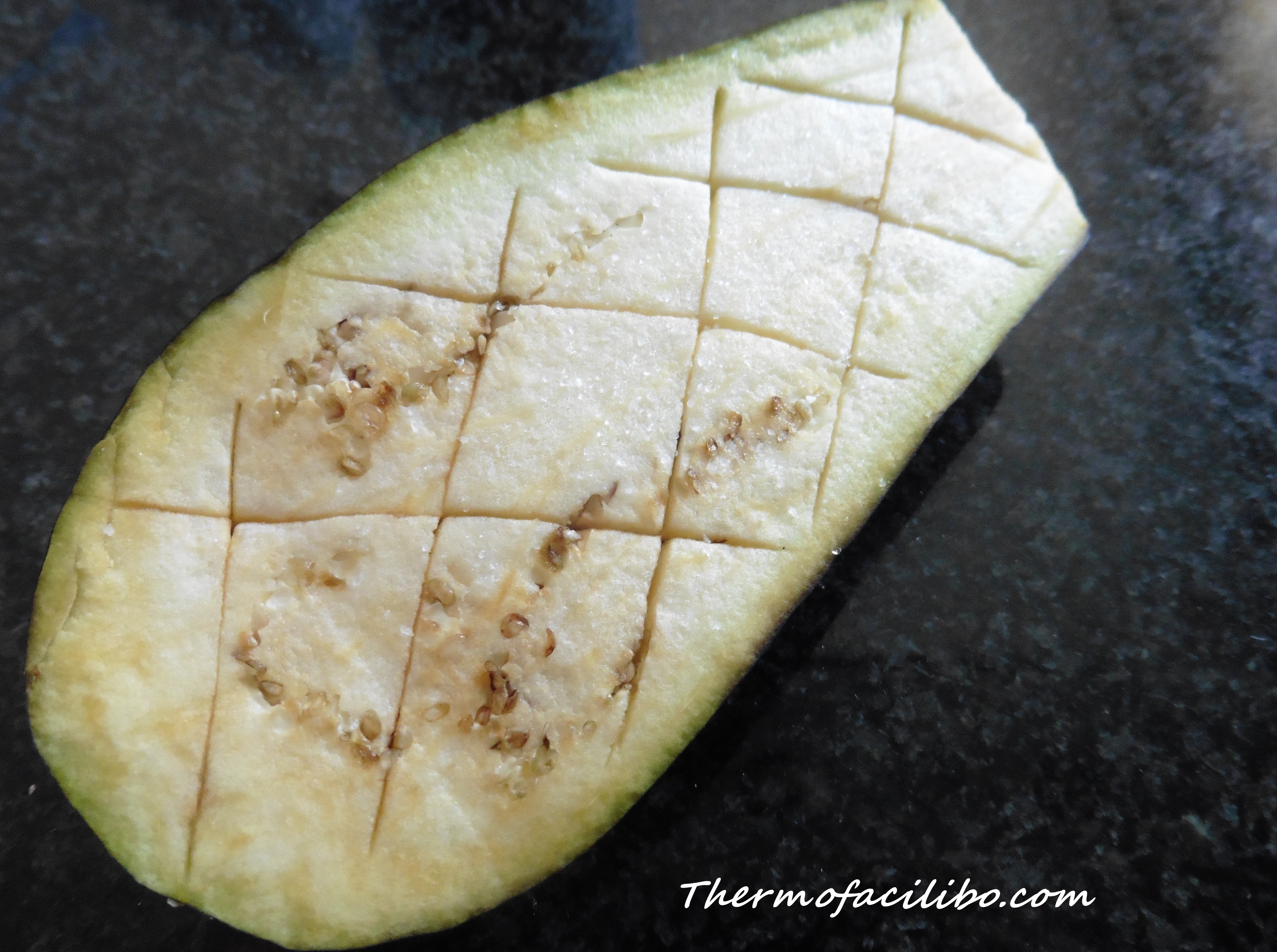 - Rentar i tallar les albergínies longitudinalment. Els i fem uns talls a la polpa en diagonal (de dalt a baix, dreta i esquerra, formant una cuadrícula) Salem i deixem en una escorredora cap per avall durant 10-12 minuts, perquè perdin l’amargor.