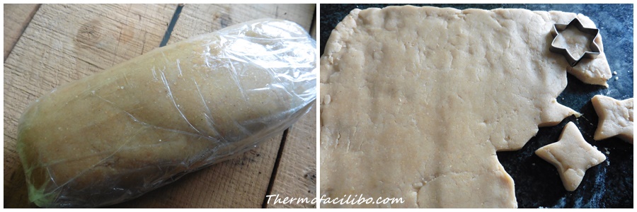 6. Repartim un xic de farina sobre el marbre de cuina i estenem la massa amb el corró. Ens podem ajudar amb les mans, perquè quedi ben premsada  o bé podem estirar la massa dins d’una bossa de plàstic, és a dir, posem la massa dins d’una bossa apte per alimentació i passem el corró per sobre el plàstic fins a obtenir un gruix aproximat d’un cm. Tallem la massa amb «tallapastes» de diferents formes i les anem col·locant a la safata de forn que tenien reservada.mantecados-prep