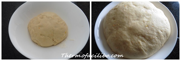 - Retirem la massa dins un bol lleugerament enfarinat, tapem amb un drap de cuina i la deixem reposar fins que dobli el seu volum (durant 1 hora o 1 1/2 h. aprox), en un lloc lliure de corrents d’aire, com ara dins el microones o el forn apagat.