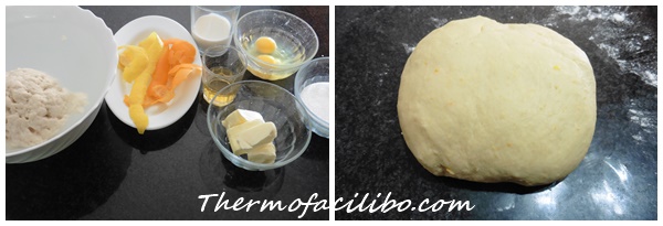 - Afegim la llet, la mantega, els ous, el llevat, l’aigua d’azahar, la farina de força, la sal i la bola de la massa mare. Barregem 30 segons a velocitat 6. A con tinuació amassar 3 minuts, velocitat espiga.