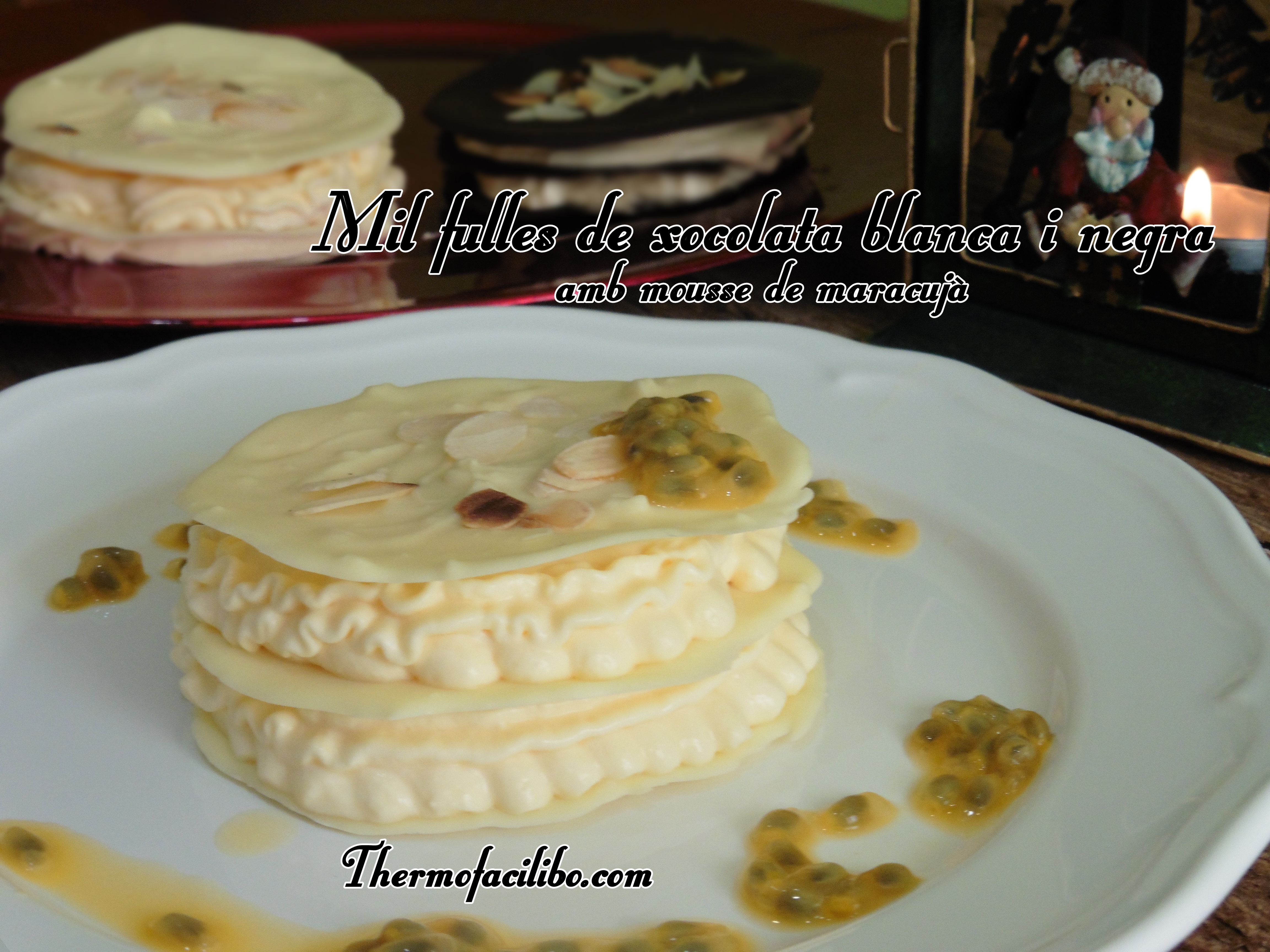 Ara que les fruiteries estan plenes de fruita exòtica i que les dates acompanyen per servir delicatessen a taula, us recomano les postres d’avui, un mil fulles de xocolata amb mousse de maracujà.