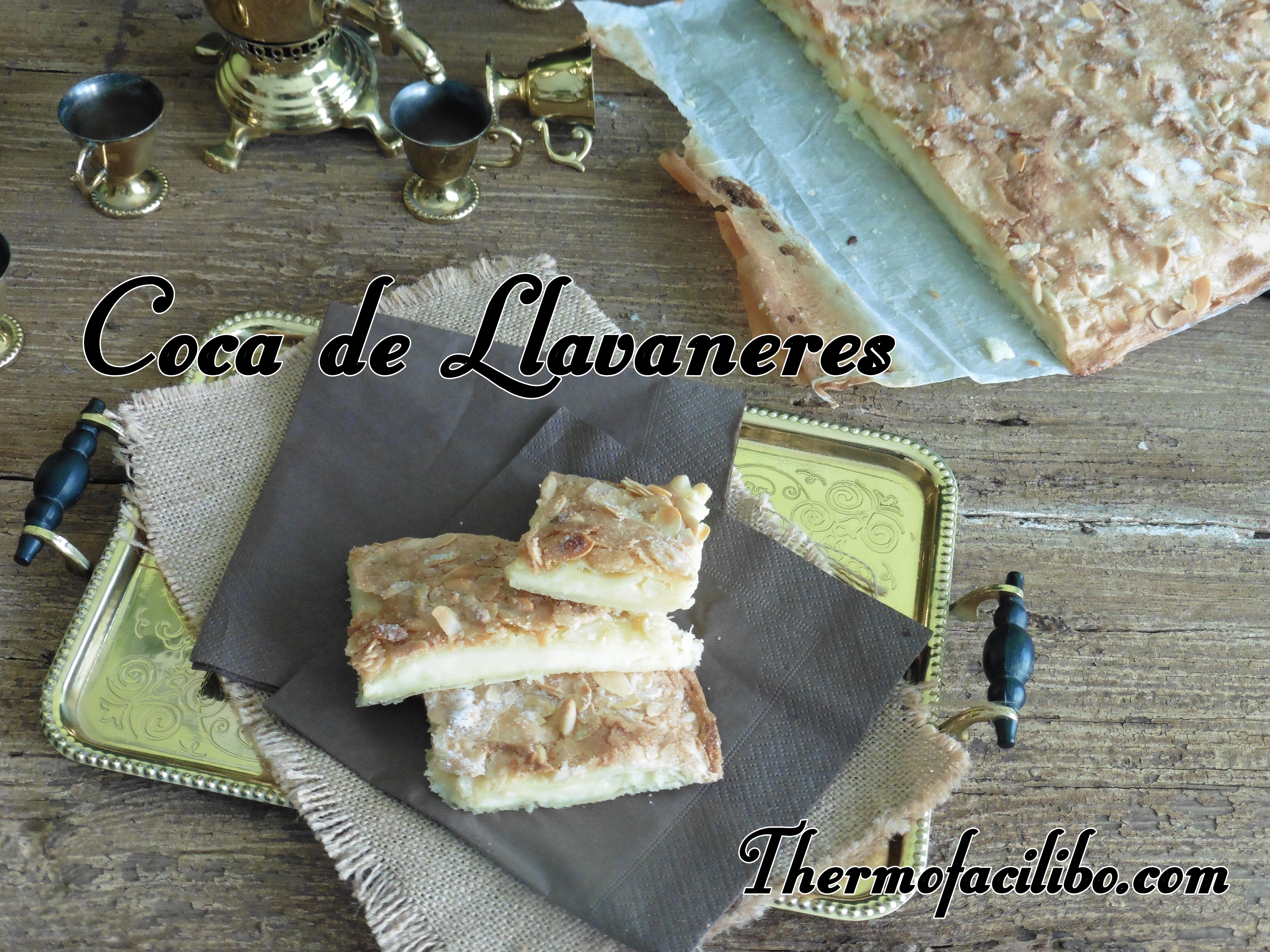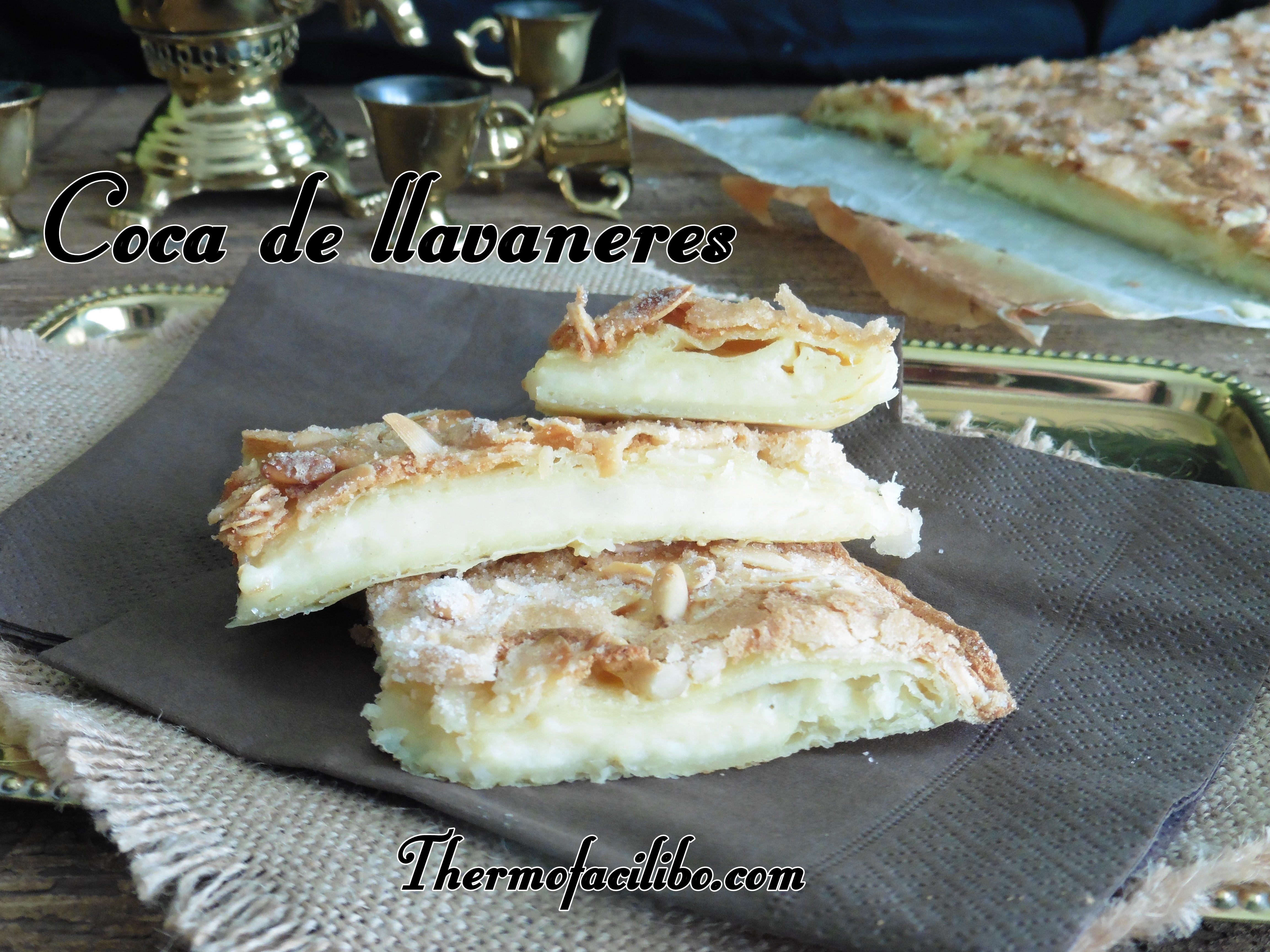 És una coca boníssima, feta de pasta de full farcida amb crema i recoberta d’una deliciosa capa de merenga o massapà, banyada amb sucre i pinyons.