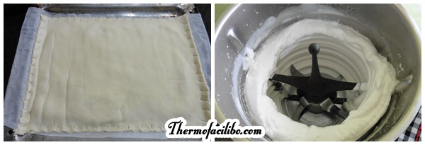 - Estenem la làmina de pasta de full sobre el mateix paper encerat que porta. Passem el corró de cuina perquè quedi fineta i la col·loquem amb el paper sobre una safata de forn. Punxem amb una forquilla per tota la superfície. Aboquem la crema freda i l’estenem amb l’ajut d’una espàtula. Deixem lliure uns 2 cm a tot el voltant. Pintem amb aigua els voltants i tapem amb l’altra làmina de pasta de full. Pressionem el voltant perquè quedi sellat i fem uns petits tallets perquè no s’obri. Punxem tota la superfície amb una forquilla. Reservem.