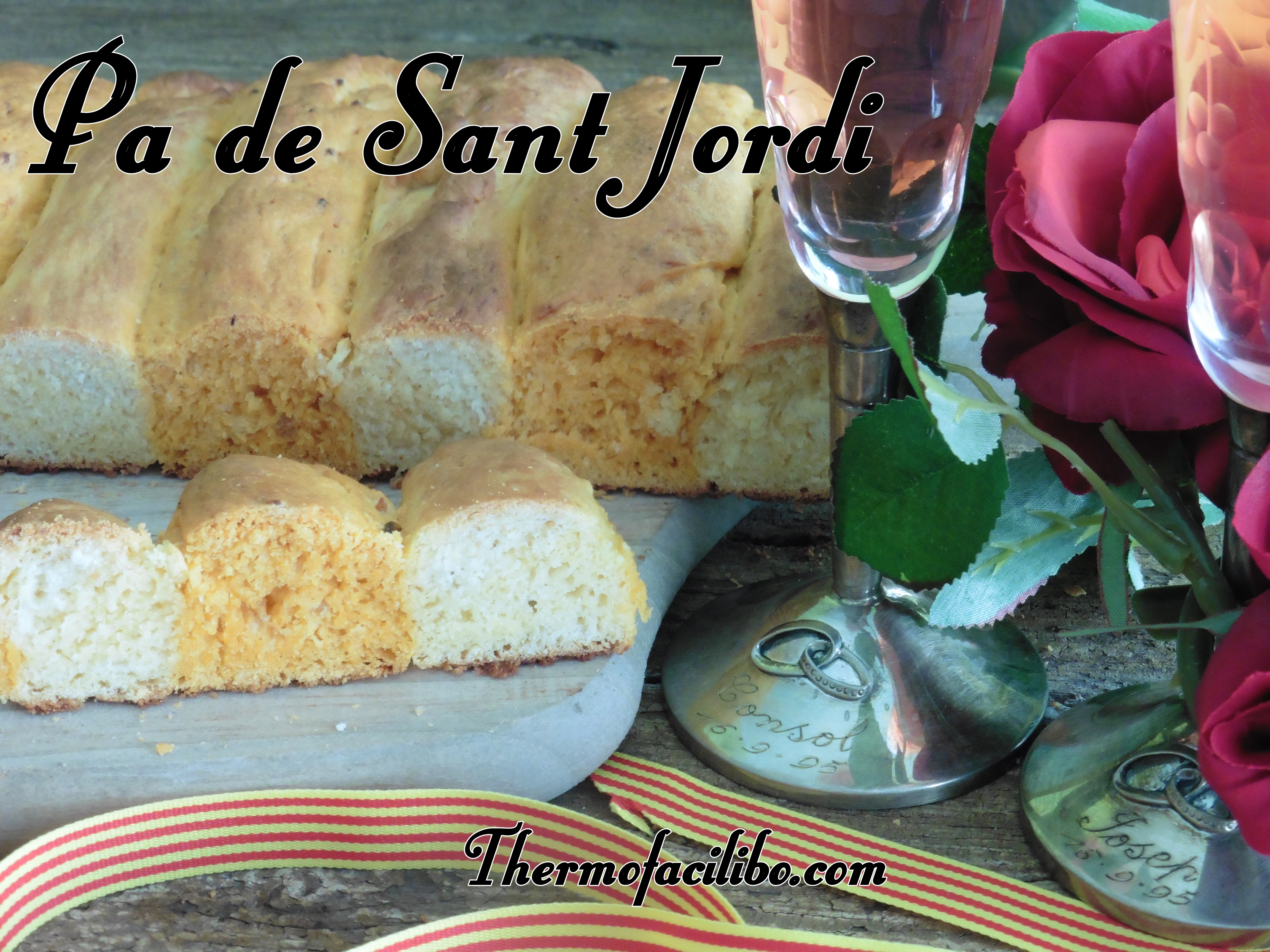 A la taula també ho podem celebrar amb un pastís de St. Jordi o un pa com el d’avui, amb la senyera marcada. És un pa amb dues masses, una de formatge i l’altre de sobrassada, no és farcit, aquests ingredients estan incorporats a la massa. A vegades si posa colorant i queda el color més pronunciat, però com que jo no sóc gaire de colorants, no ni he posat. Ha quedat un pa català, deliciós i ben natural.