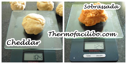 - Un cop llevades les masses hauran doblat el seu volum. Aleshores agafem la massa de formatge i la dividim en 5 parts d’aprox. 100-110 g cadascuna i la de sobrassada en 4 parts d’aprox.120- 130 g cadascuna.