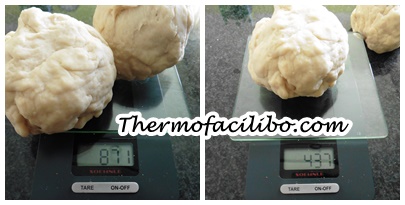 - Traiem la massa del got, pesarà entre 860-900 g aprox. i la dividim per la meitat. Cada part pesarà entre 430-450 g aprox.