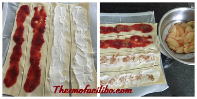 6.-Col·loquem les làmines de poma en una meitat de cada tira, deixant que sobresurti un xic la pell de la poma.