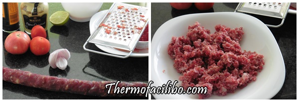 3.-Tallem el fuet a trossos i el posem dins el got de la thermomix, afegim la ceba. En el meu cas el fuet era tou i vaig programar 10 segons a velocitat 5-7. A continuació vaig baixar les restes cap a les ganivetes i vaig tornar a programar 5 segons a velocitat 8. ALERTA!, depèn molt de la textura del fuet. Si és més sec o més tendre el temps de trituració serà diferent. Per tant aconsello que programeu de mica en mica i observeu fins que quedi la textura perfecta.
