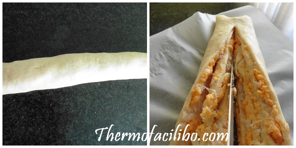 - Repartir el formatge ratllat i la ceba tendra trossejada per tota la superfície de la massa deixant lliure una vora de 2 cm a la part més ampla. Pinzellar aquesta vora amb aigua i començar a enrotllar la massa des del costat oposat. Tallar el rotlle per la meitat al llarg, deixant un dels extrems sense tallar. Creuar la massa de forma que quedi el tall mirant cap dalt.