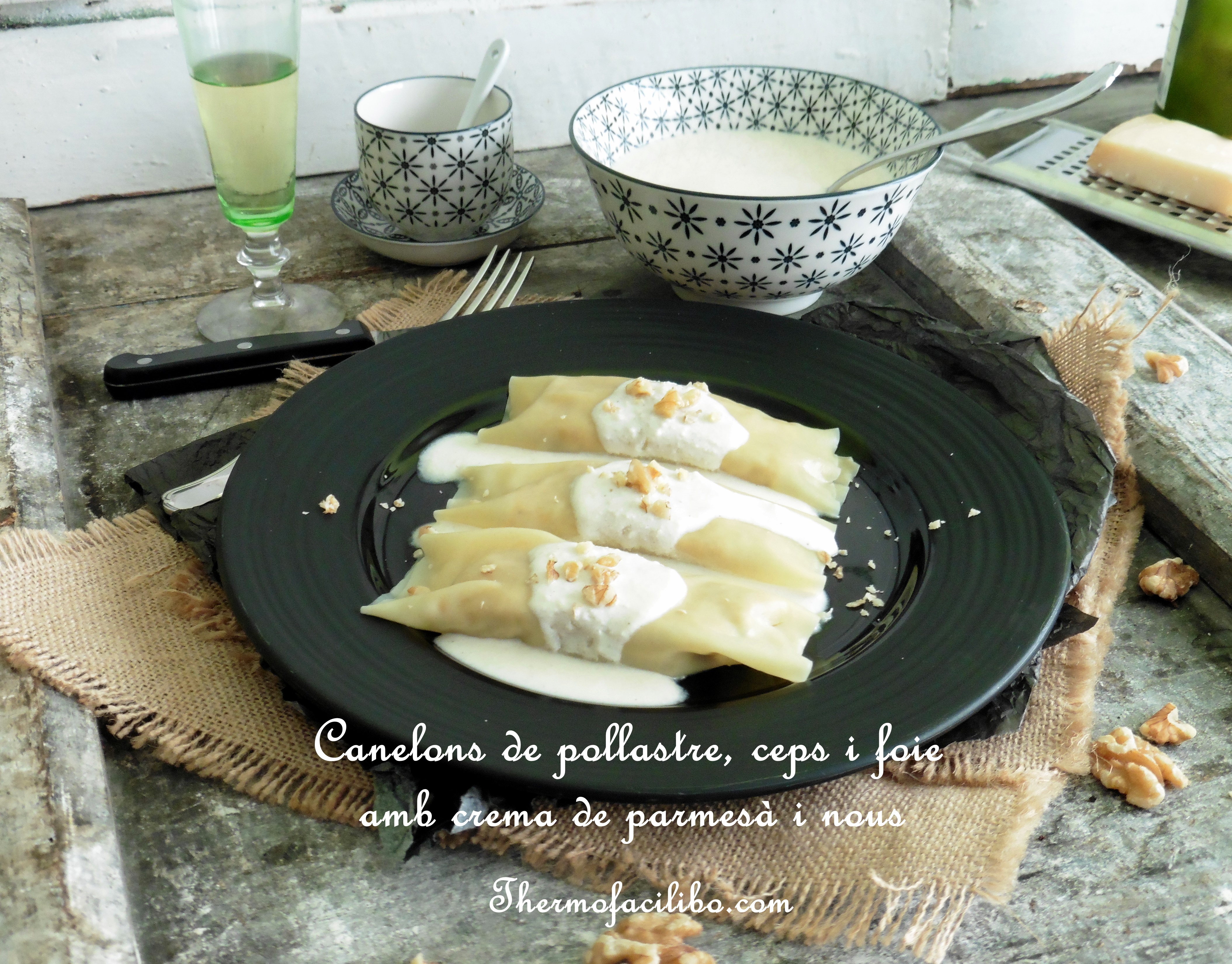 - Col·locar els canelons en els plats o safata que vulguem servir. Repartir la crema de parmesà pel damunt i esmicolar unes nous al damunt.