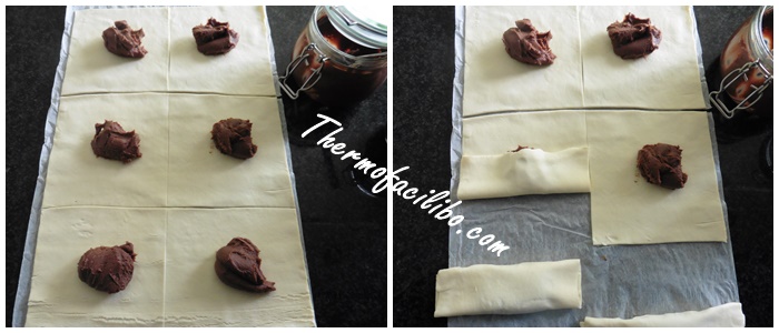 - Posar una cullerada de crema de cacau al centre de cada part.