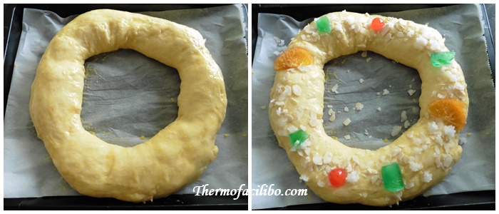 - Mentrestant, pinzellar un tortell amb ou batut, molt suaument perquè no ens baixi la massa. Col·locar ametlles filetejades, fruites confitades i sucre humitejat amb unes gotes d’aigua.