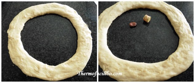 - Agafar una bola i amb els dits obrir un forat al mig. Anar girant la massa amb les mans i anar obrint el forat, de manera que quedi un gran forat al mig i el mateix gruix per tota la superficie del tortell. Ara és el moment de posar la fava i la figureta, embolicades amb paper d’alumi i ben amagades dins la massa.