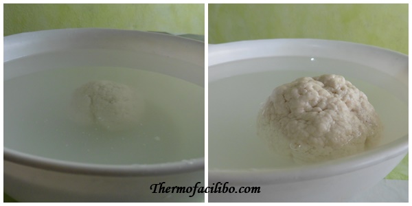 - Retirar la massa del got, formar una bola i introduir-la dins un bol amb aigua temperada que la cobreixi totalment. Quan la bola floti i hagi doblat el seu volum, estarà llesta (aprox. 15 minuts).