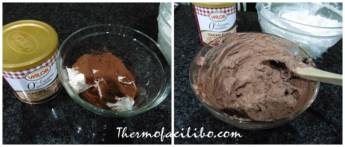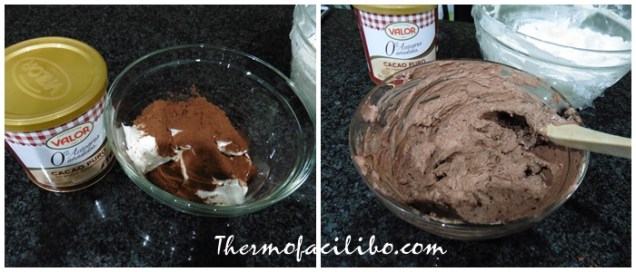 - Separar 250 g de nata muntada i abocar-la dins un bol. Afegir les dues cullerades de cacau pur en pols i barrejar amb moviments suaus i envoltants fins que quedi ben integrat. Tapar el bol amb film transparent i reservar a la nevera.