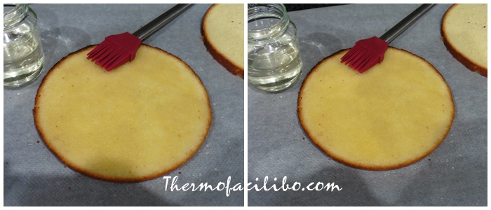 - Col·locar el disc que serà la base del pastís sobre paper de forn i pinzellar tot el disc amb una part de l’almívar. A sobre estendre la meitat de la nata muntada reservada (250 g aprox), de manera que quedi del mateix gruix per tota la base.