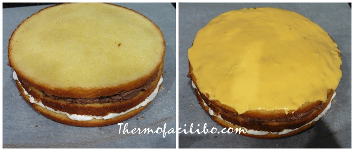 - Per últim col·locar el darrer disc sobre la capa de trufa, pressionant lleugerament. Pinzellar la part superior amb l’almívar reservat i estendre al damunt la crema de gema.