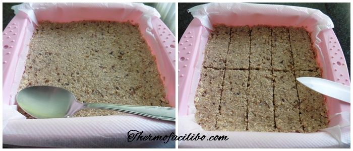 - Abocar la mescla en el motlle preparat i pressionar amb una cullera o base d’un got perquè quedi ben premsat i amb la superfície anivellada. Marcar amb un ganivet el tall de les barretes (aprox. 5×10 cm)