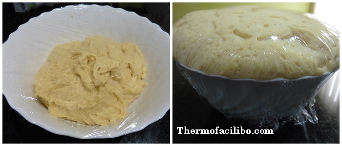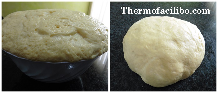 - Treure la massa i deixar llevar en un bol lleugerament enfarinat. Tapar amb film transparent, amb la superfície que estarà en contacte amb la massa quan creixi, untada amb oli (d’aquesta manera en retirar el film no quedarà enganxat en la massa. Fixeu-vos en la foto, quan he retirat el film la massa ha quedat intacte).Deixar llevar fins que dobli el seu volum. Durant una hora o hora i mitja (depèn de la temperatura ambient), en un lloc lliure de corrents d’aire, com ara el forn apagat.