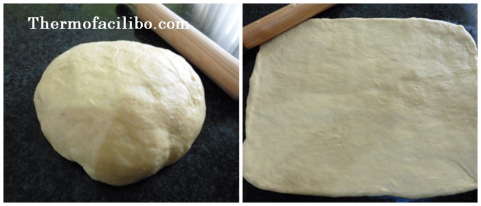 - Formar una bola amb la massa. Untar el taulell de cuina i el corró amb oli (perquè la massa no s’enganxi) I amb el corró formar un rectangle d’aprox. 1 cm de gruix.