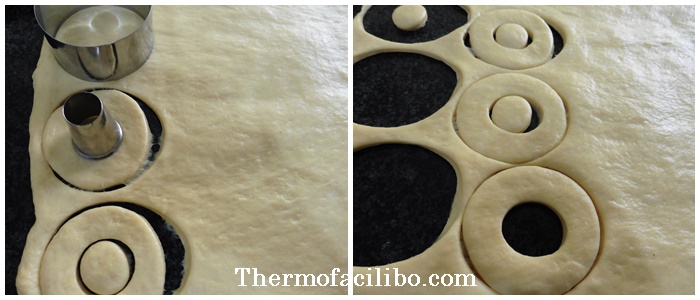 - Anar posant el cercles en safates de forn folrades amb paper de fornejar i deixar llevar fins que doblin el seu volum.(Jo les deixo dins el forn apagat) Si alguna safata no hi cap, la deixem tapada amb un drap de cuina, perquè no toqui l’aire als donuts mentre lleven.