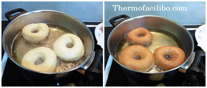 - Escalfar abundant oli de girasol en una cassola i anar fregint per tandes els dònuts. Primer un cantó i després voltejar i l’altre cantó fins que siguin daurats. Tenir compte de no desinflar ni deformar la massa quan els agafem per posar-los a fregir.