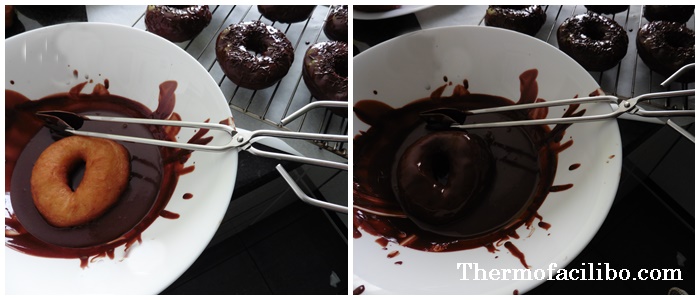 - Agafar els altres donuts (15 unitats més aprox.) i banyar-los dins el bol amb la cobertura de xocolata, aquests sí, que els submergim totalment. Retirar-los amb unes pinces i deixar-los assecar sobre una reixeta (amb paper de fornejar a sota, per recollir les restes de xocolata). Opcionalment abans que siguin secs afegir fideus de xocolata al damunt de cada donut.