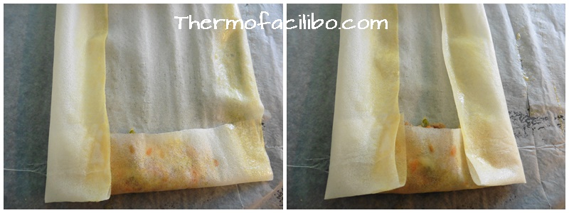 - Enrotllar, només una gir (com es veu a la foto), i untar amb ou batut els laterals.