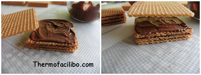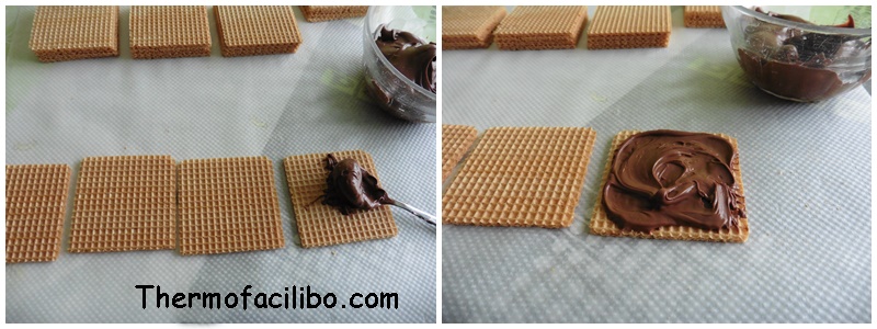 - Untar amb crema de cacau un cantó de la galeta, al damunt, col·locar una altra galeta i untar-la també amb crema de cacau. Tornar a col·locar una altra galeta, untar-la també amb crema de cacau….