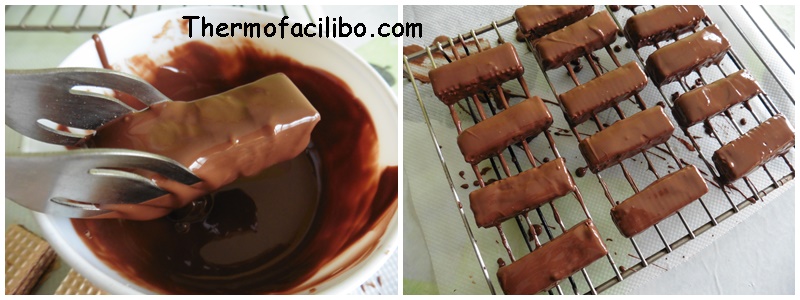 - Banyar cada part en la xocolata desfeta. Tot seguit, col.locar-los en una reixeta, amb paper de fornejar al sota, perquè deixin anar l’excés de xocolata i deixar que aquesta s’endureixi.