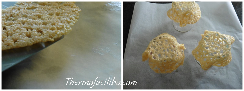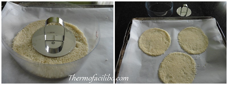 - Col·locar un cèrcol d’emplatar de 15 cm de diàmetre (jo he utilitzat tira d’acetat per fer un cèrcol d’aquesta mida) sobre una safata de forn folrada amb paper de fornejar i repartir 2 cullerades soperes de parmesà ratllat dins el cèrcol, repartir bé. Repetir el procediment 2 cops més (És a dir, sobre cada safata de forn faig 3 cèrcols).